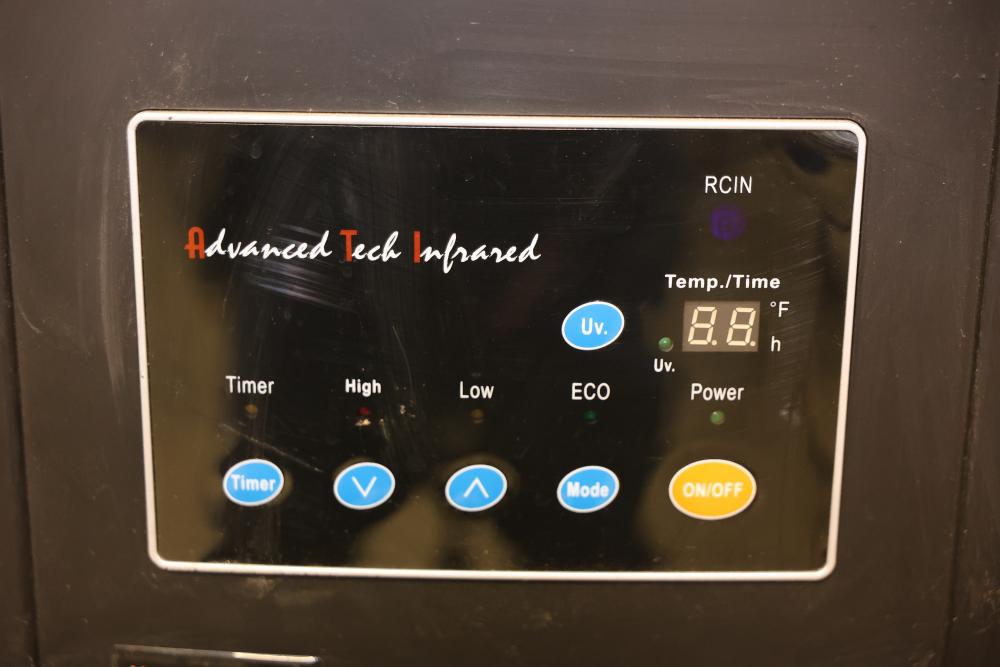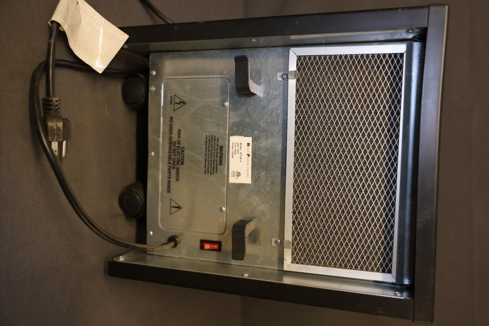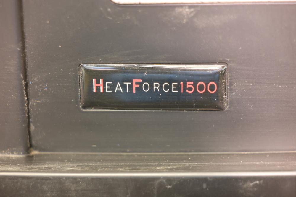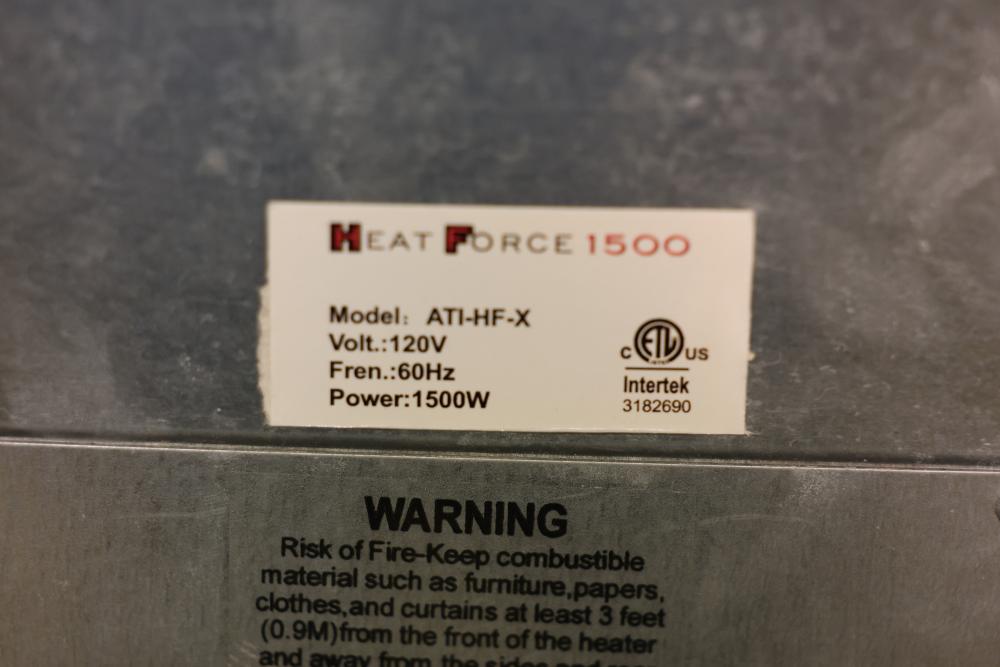 Heat Force 1500 Infrared Heater Model ATI-HF-X featuring a digital control panel with timer, temperature settings, and power options. Operates at 120V, 60Hz, with 1500W power. Includes a functioning standard plug and a durable black housing with minor surface wear. Pickup only.