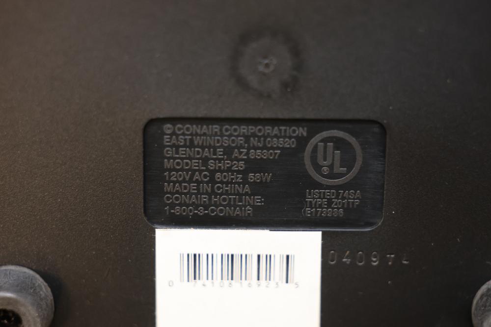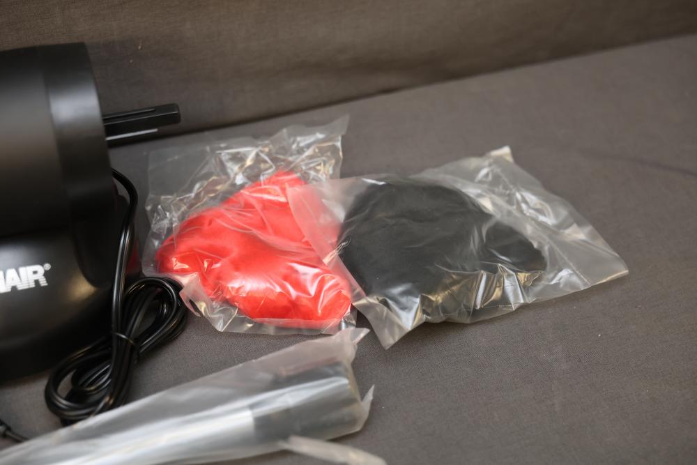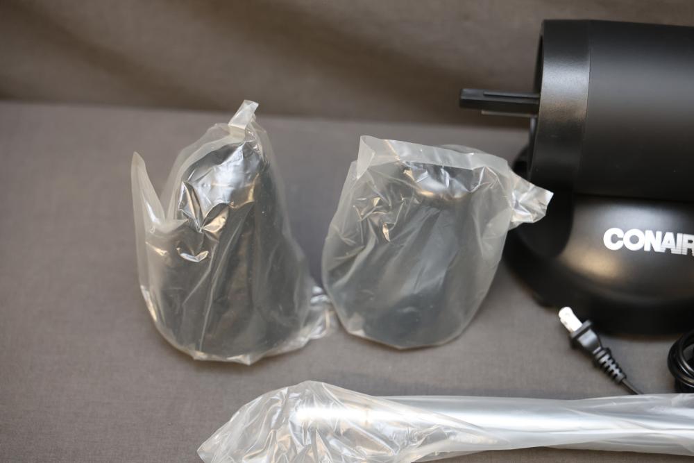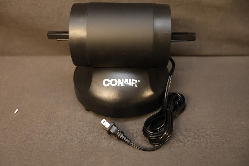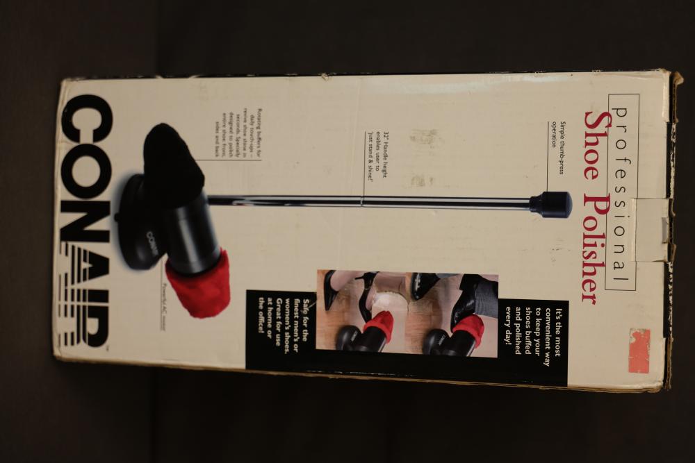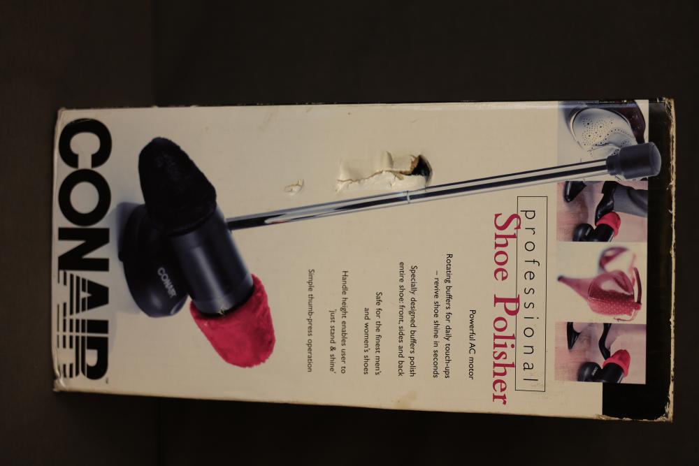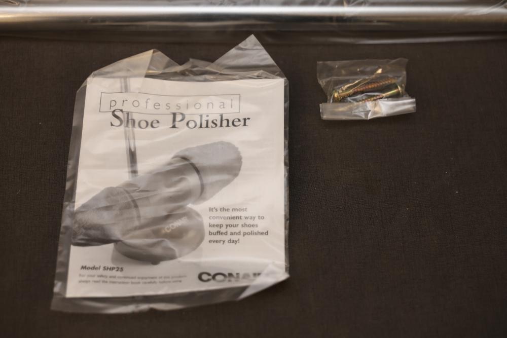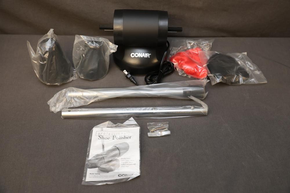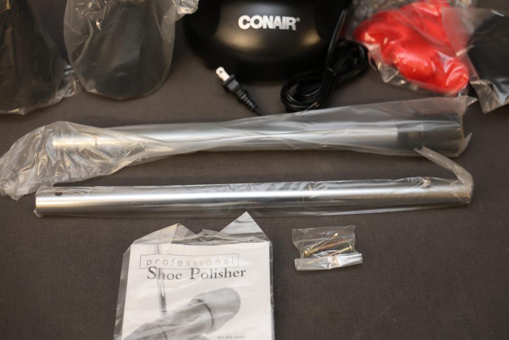 Conair Professional Shoe Polisher with Accessories and Manual. Includes the main unit, two polishing heads in red and black, adjustable pole attachments, screws, and an instruction manual. Comes with original box. Pickup only.