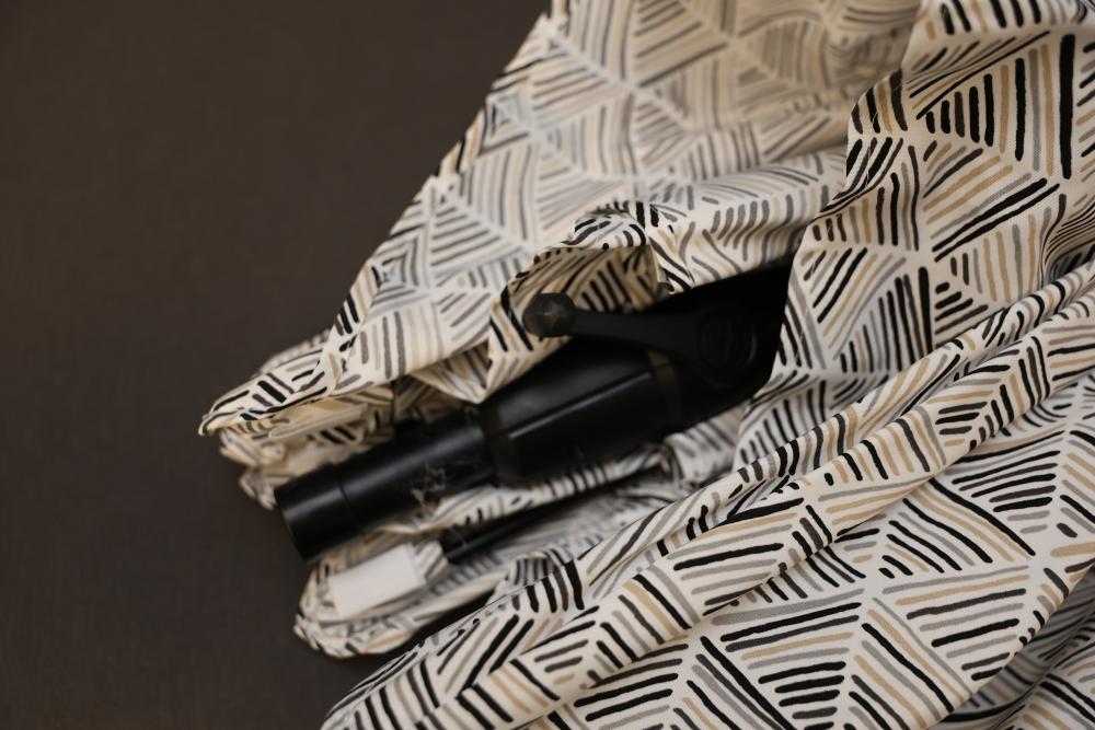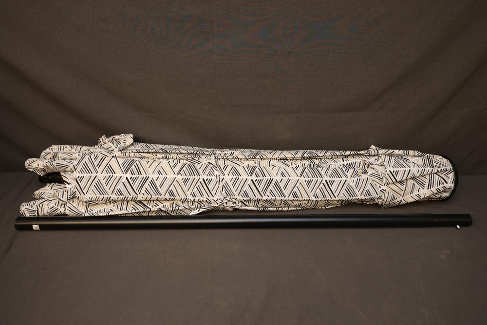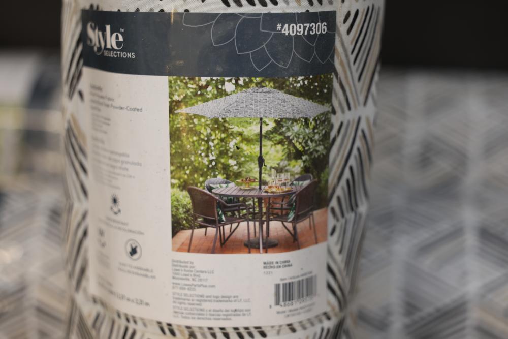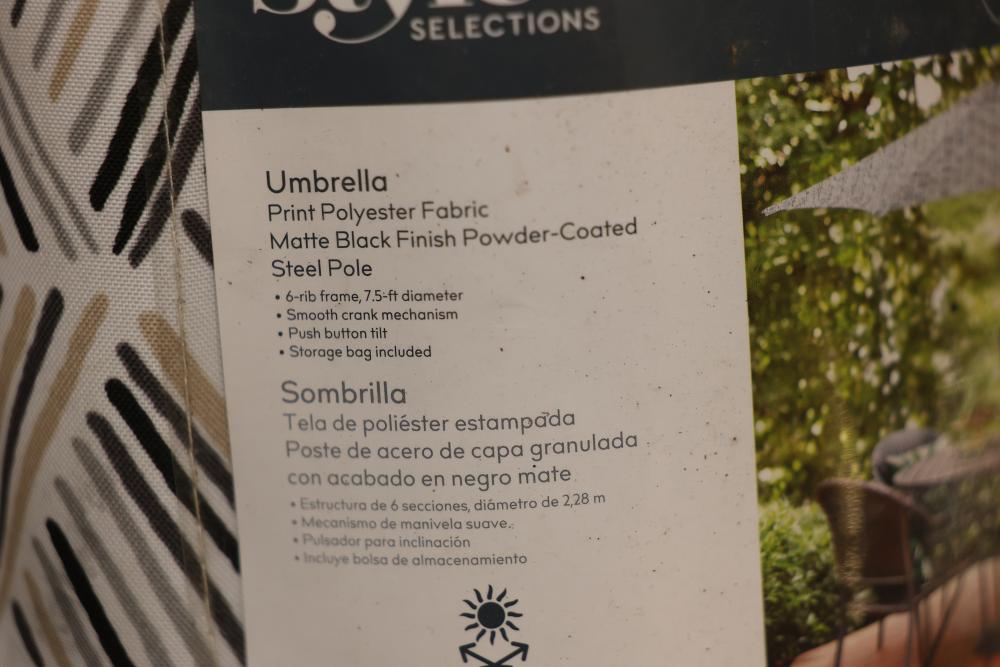 Patio Umbrella with Printed Polyester Fabric and Matte Black Powder-Coated Steel Pole. Features a 7.5-foot diameter canopy, push-button tilt mechanism, and smooth crank operation. Includes a storage bag for easy handling. Pickup only.