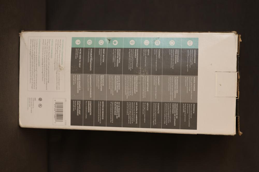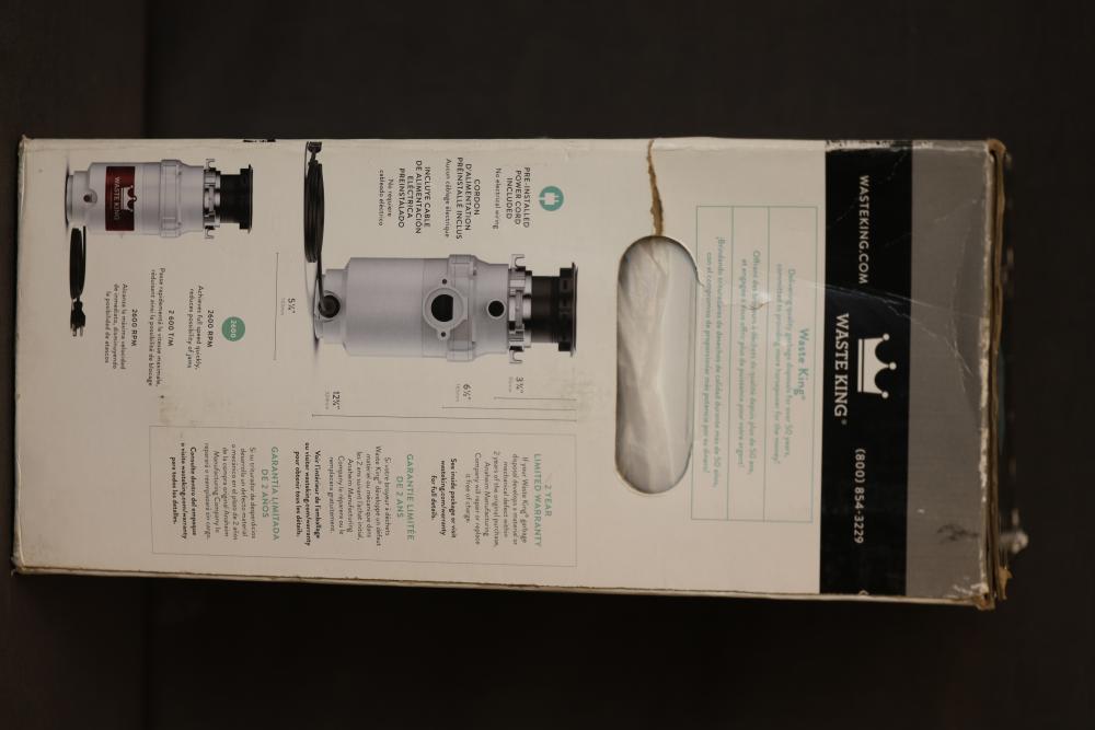 Waste King L-1001 1/2 HP Garbage Disposal with Accessories. Includes the main unit, installation components, user manual, and original packaging. The disposal features a 2600 RPM motor, requires 1-phase 60 Hz power supply, and is thermally insulated. Pickup only.