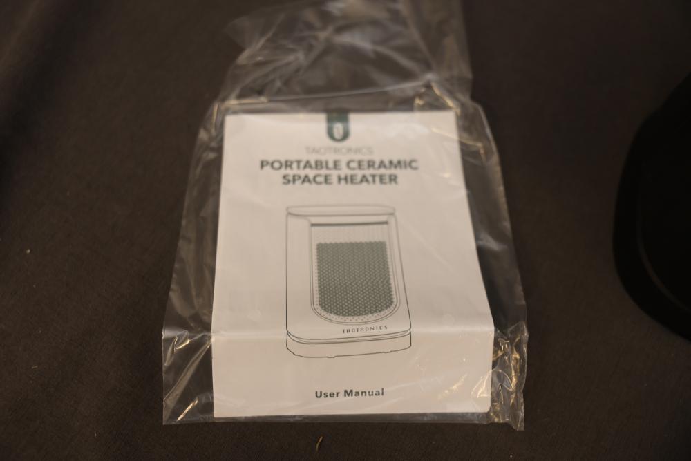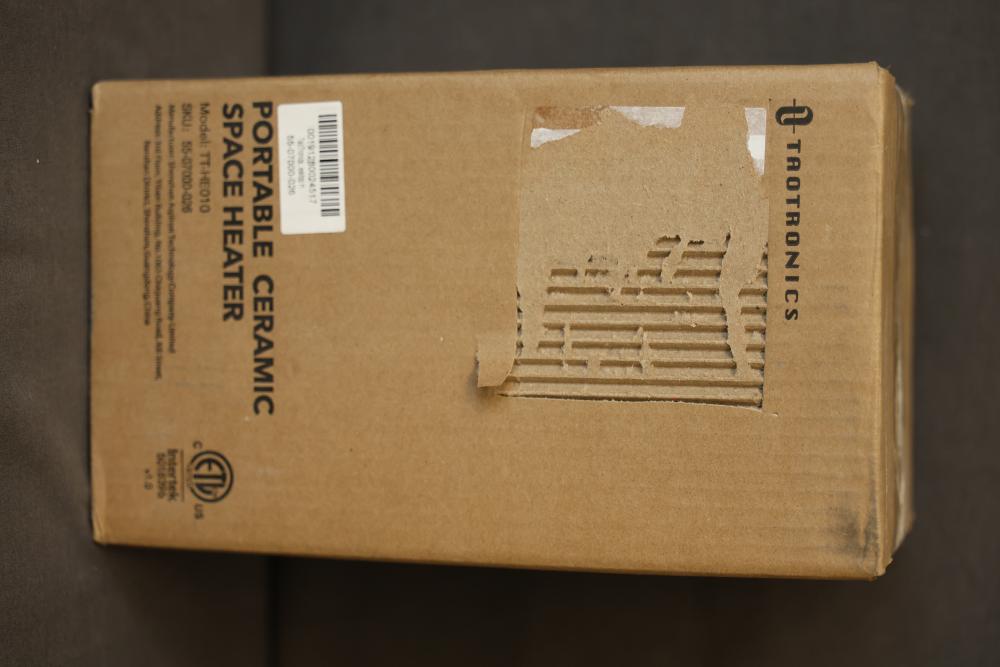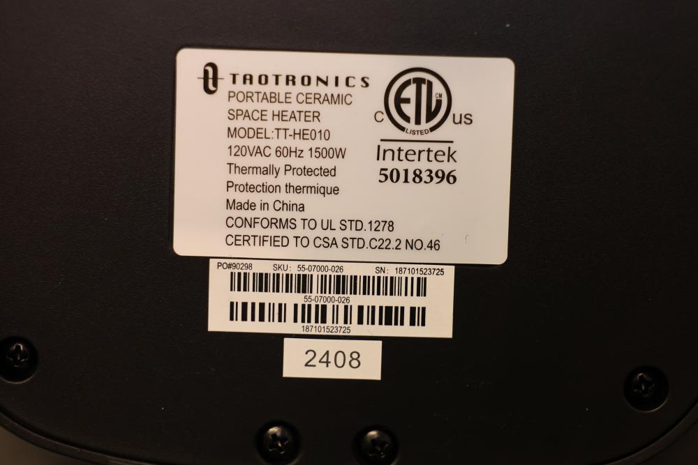 TaoTronics Portable Ceramic Space Heater, Model TT-HE010. Features 120VAC, 60Hz, 1500W power specifications with thermal protection. Includes the original packaging and user manual. Pickup only.