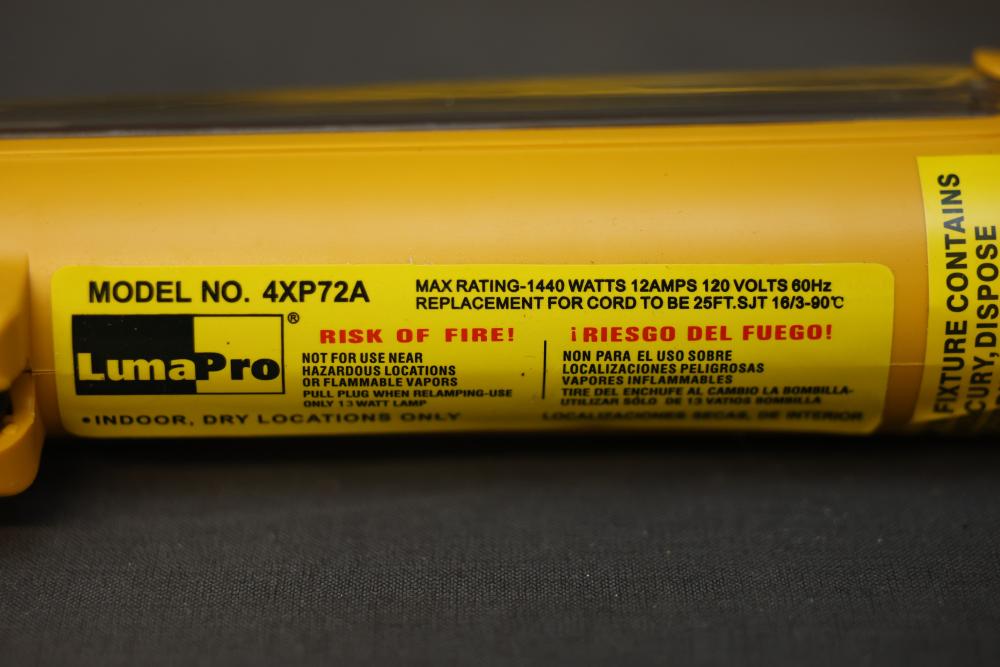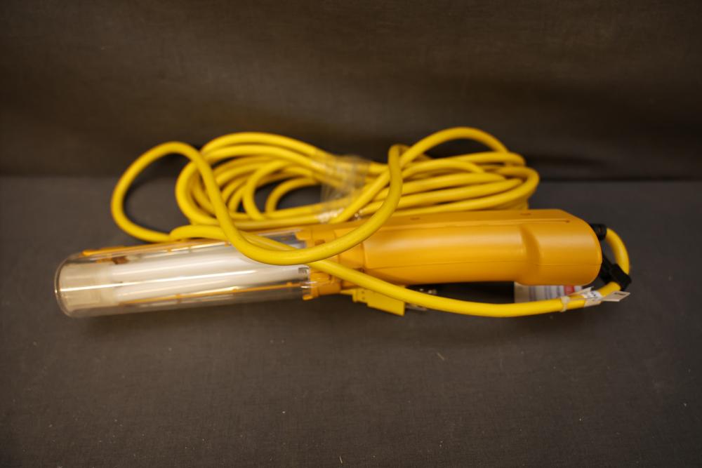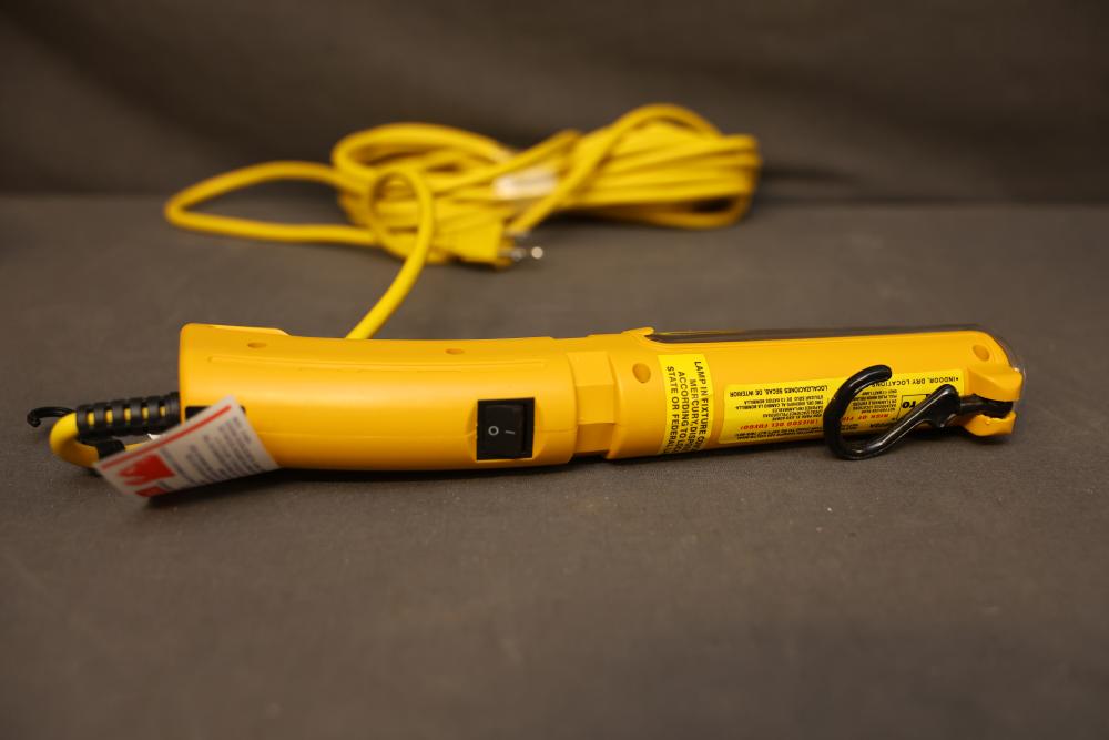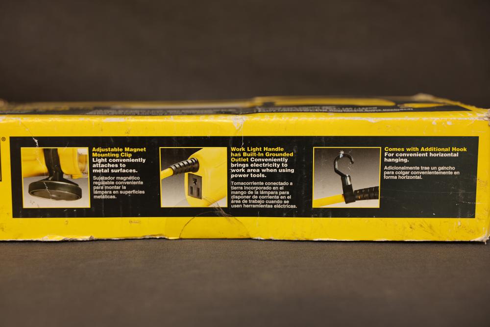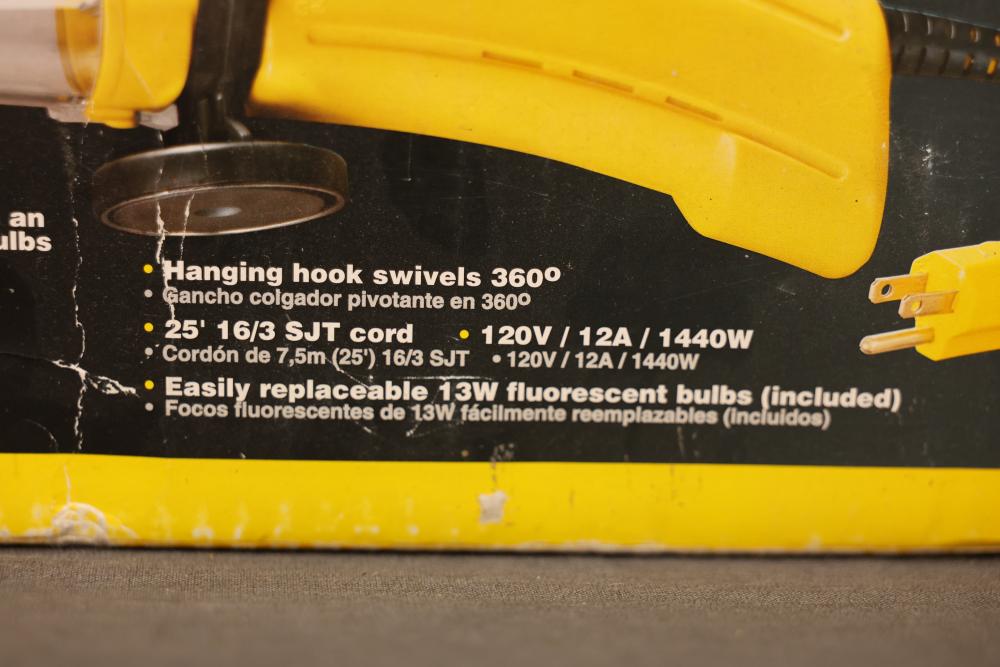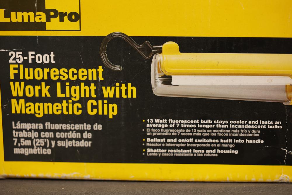 LumaPro 25-Foot Fluorescent Work Light With Magnetic Clip. Features a swiveling hanging hook, adjustable magnetic clip for mounting on metal surfaces, and a 1440W-rated 25-foot 16/3 SJT cord. Includes an easily replaceable 13W fluorescent bulb that stays cooler and lasts longer compared to incandescent options. Designed for indoor or dry locations. Pickup only.