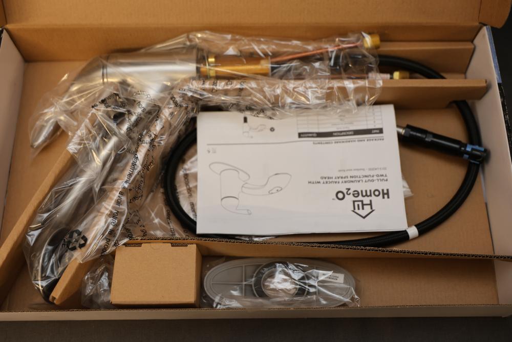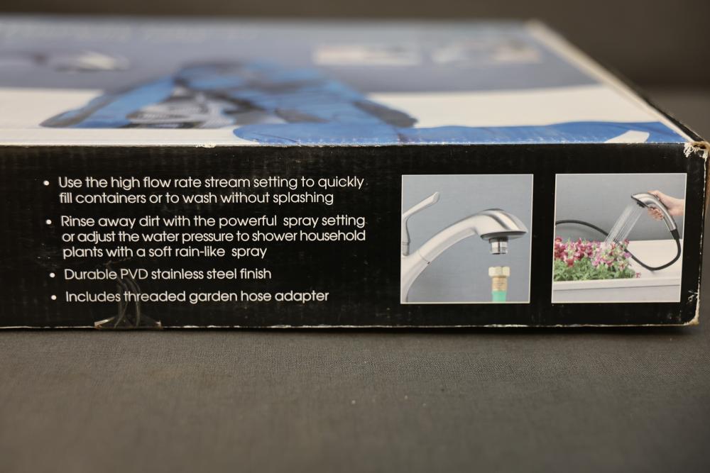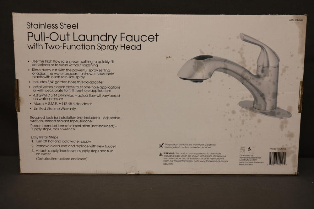 Stainless Steel Pull-Out Laundry Faucet With Two-Function Spray Head. Features a high-flow rate stream setting for quickly filling containers without splashing, and a spray setting for rinsing dirt or soft rain-like watering. Includes a durable PVD stainless steel finish and a threaded garden hose adapter. Pickup only.