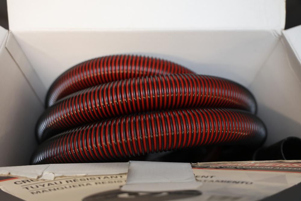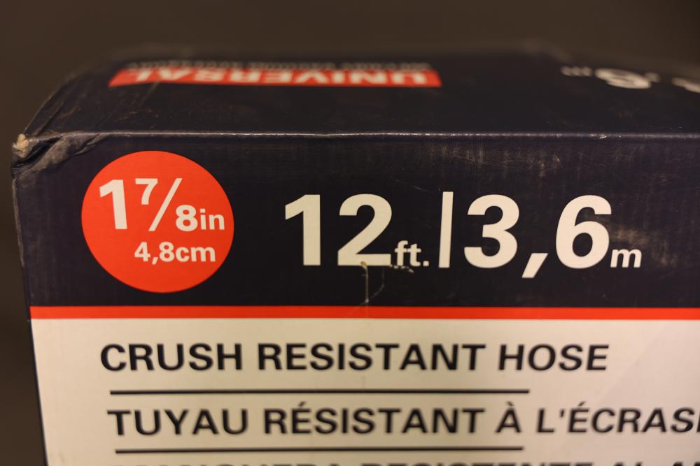 Universal 12 ft Crush Resistant Wet/Dry Vacuum Hose with Adapter. The hose measures 12 feet long and 1-7/8 inches in diameter. Designed as a wet/dry vacuum accessory, it includes adapter fittings to connect various compatible vacuum units. In new condition and packaged in the original box. Pickup only.