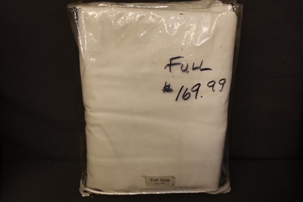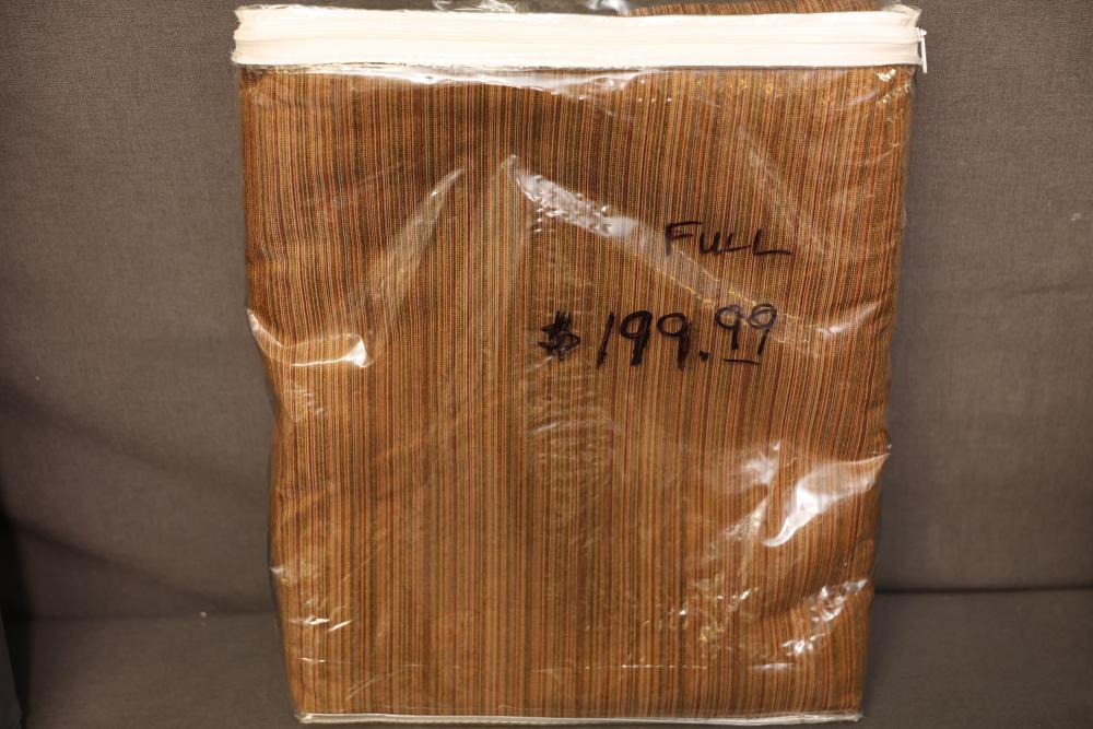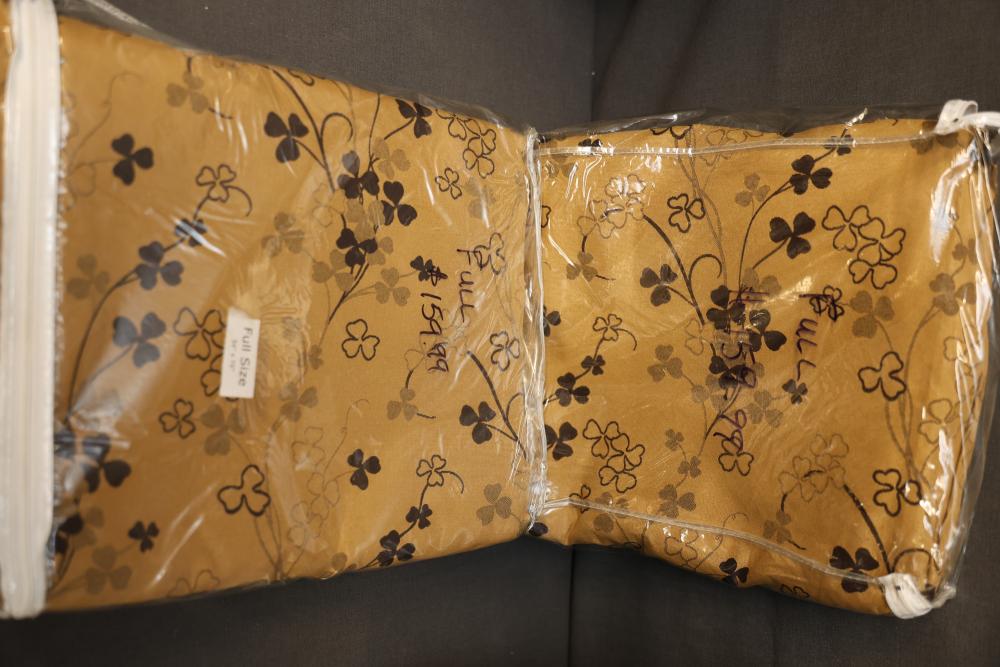 Full-Size Bedding Ensembles in Various Designs. Includes multiple sets of full-size bedding with varying patterns and colors, still sealed in plastic packaging. Some sets have pricing marked on packaging. Includes floral patterns, solid colors, and other decorative designs. Pickup only.