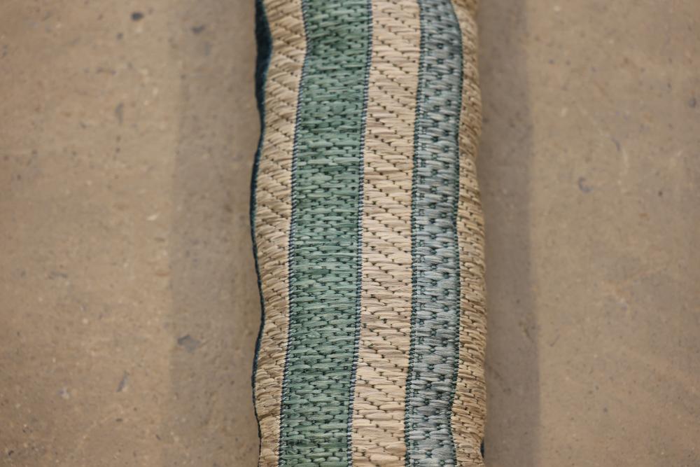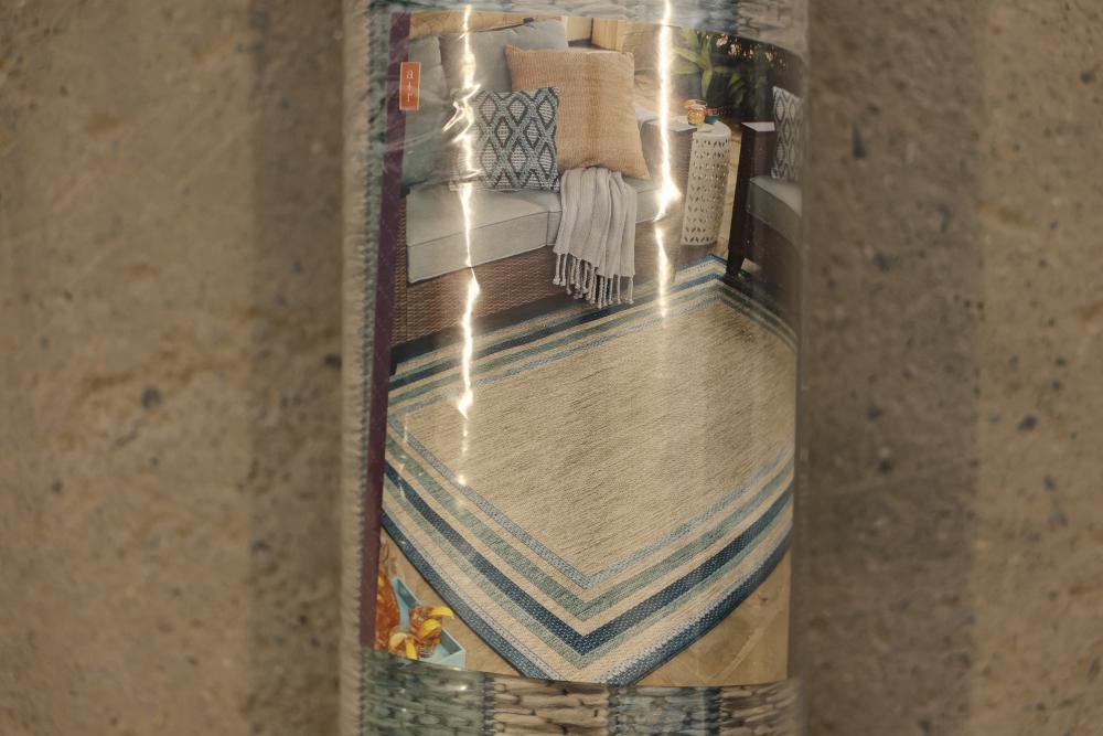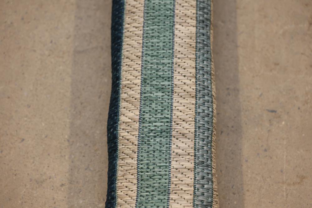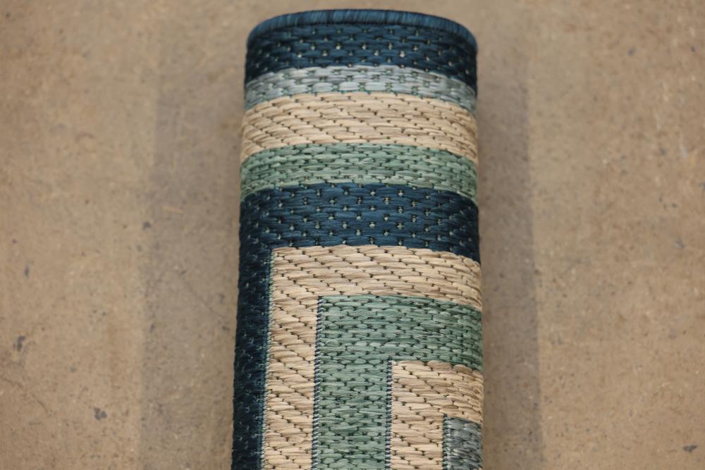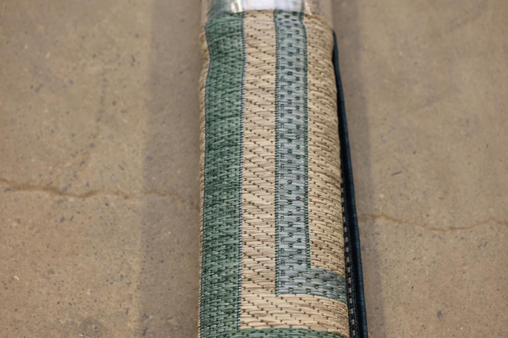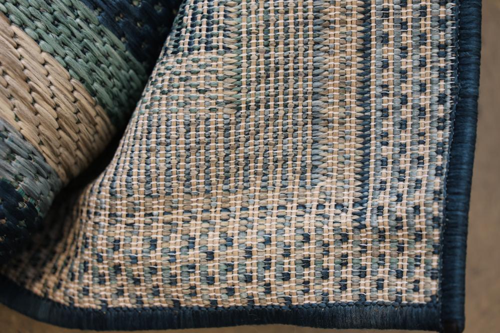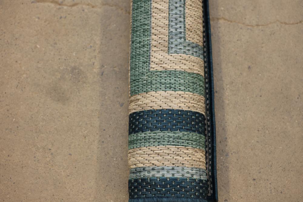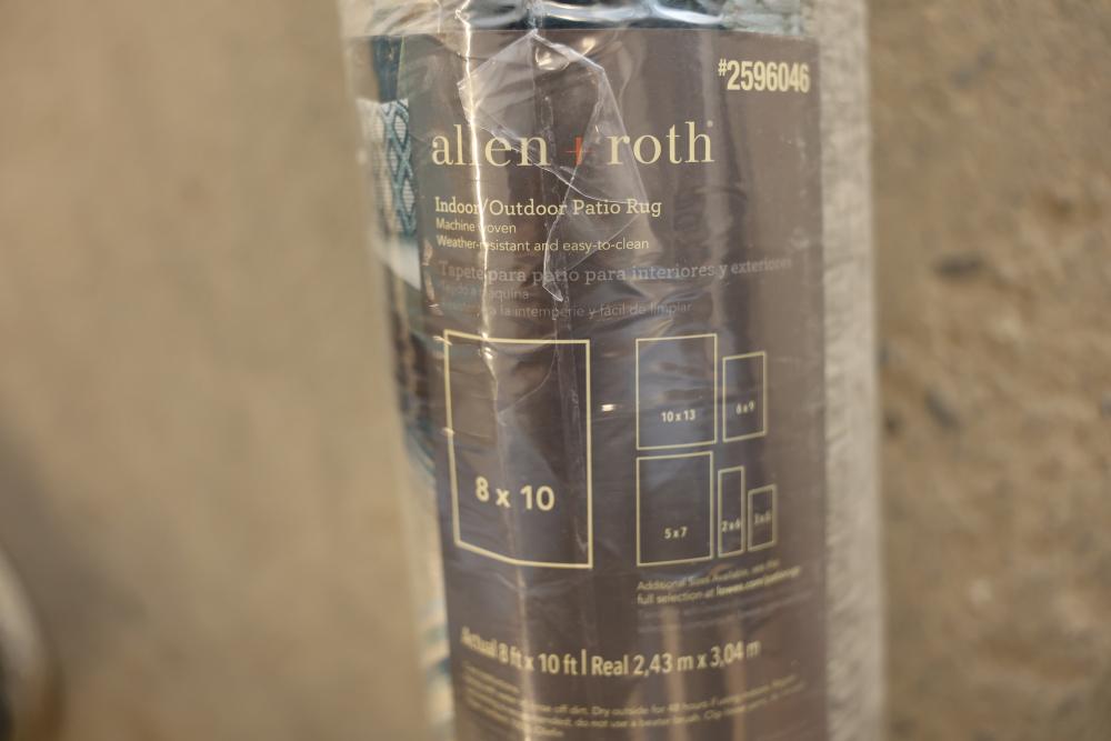 Allen & Roth 8 x 10 Indoor/Outdoor Patio Rug. Features a woven design suitable for indoor and outdoor use. The dimensions are 8 feet by 10 feet, making it ideal for patios or living spaces. The rug showcases striped detailing in shades of green, blue, and beige. Designed for durability in multiple environments. Pickup only.