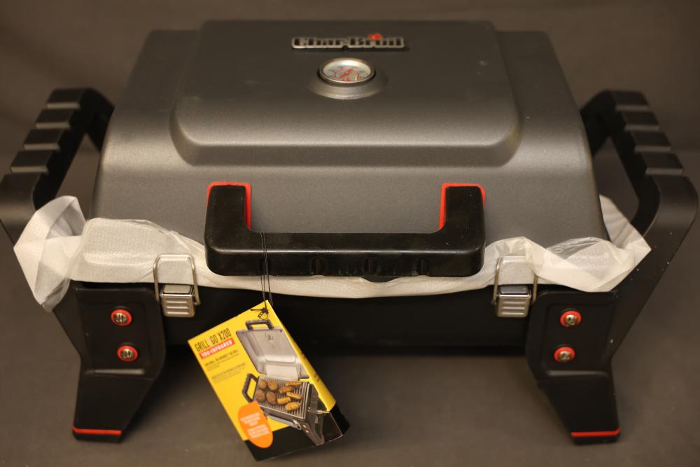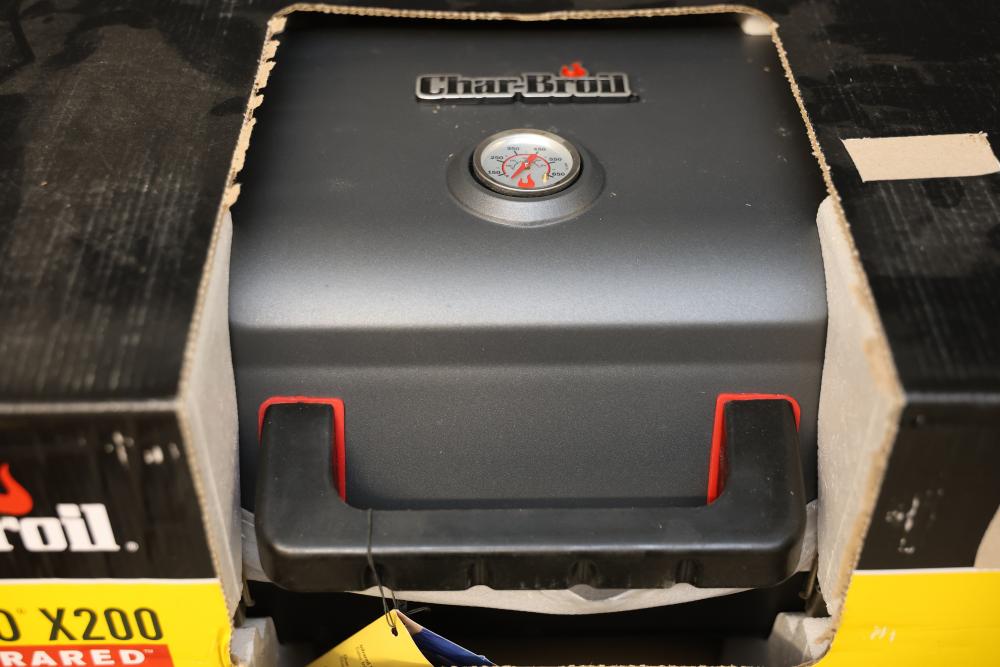 Char-Broil Grill2Go X200 Tru-Infrared Portable Gas Grill. Features a durable, compact design with a high-impact frame and built-in handles for portability. Includes a lid-mounted temperature gauge, TRU-Infrared cooking system for even heat distribution, and stainless steel grates. Comes in original packaging with accessories and instructions. Pickup only.
