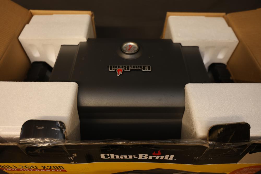 Char-Broil Grill2Go X200 TRU-Infrared Portable Gas Grill. Compact and portable design includes a durable black lid, handles for transport, and a gauge on the top. Features infrared cooking technology for even heat distribution. Includes original packaging and accessories. Perfect for outdoor grilling needs. Pickup only.