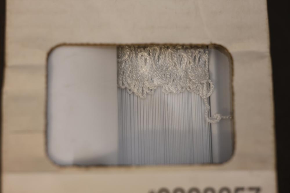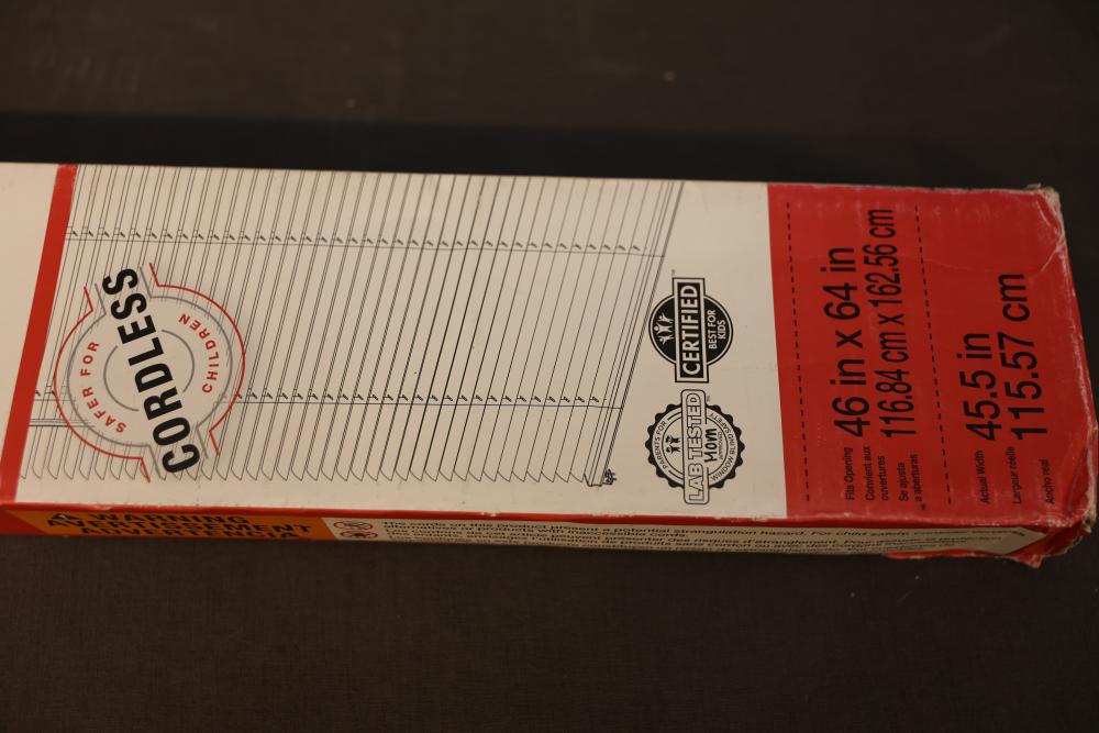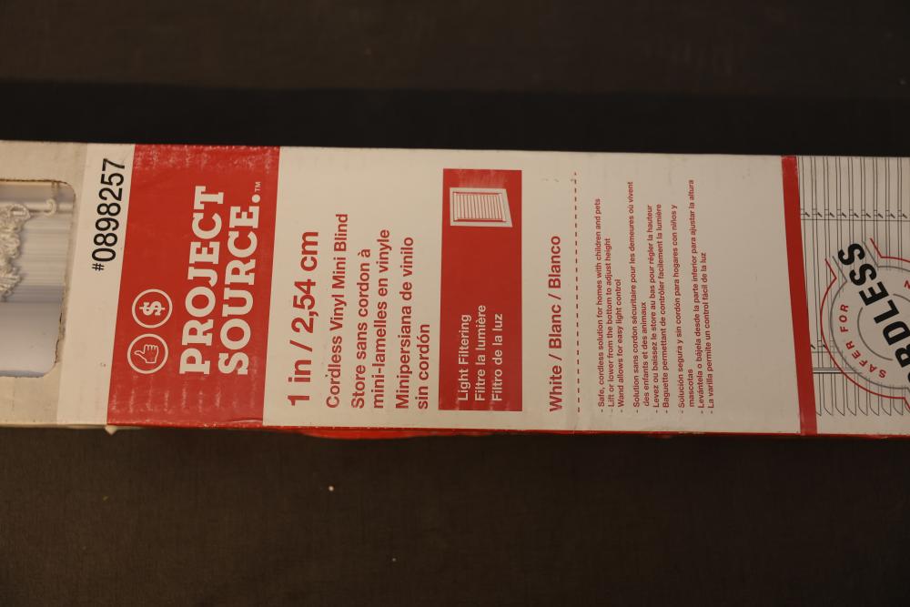 Project Source 1-Inch Cordless Vinyl Mini Blinds, 46 x 64 Inches, White. Designed with a light-filtering feature and child-safe cordless operation. Dimensions are 46 inches by 64 inches (116.84 cm by 162.56 cm). Suitable for windows requiring a clean and functional covering solution. Pickup only.