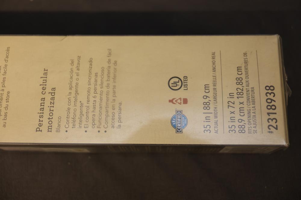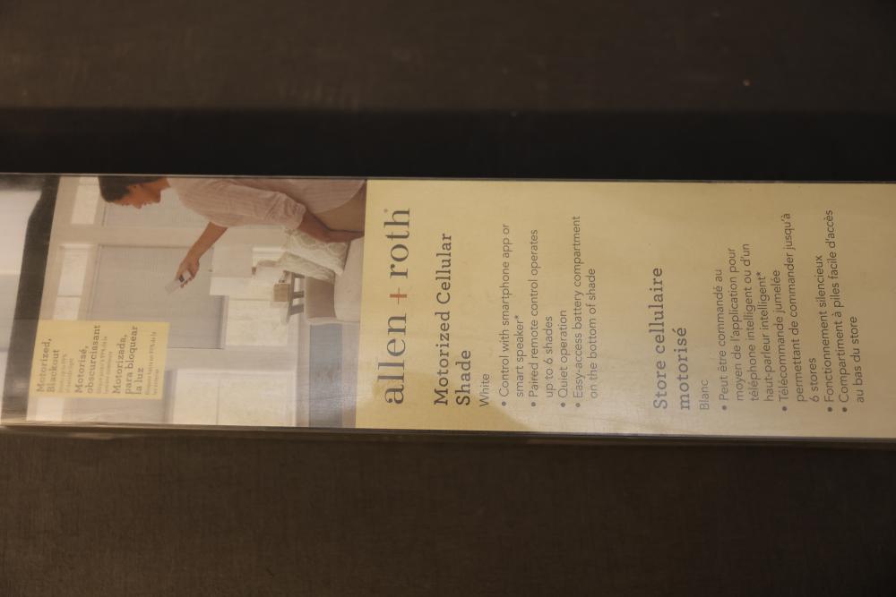 Allen + Roth Motorized Cellular Shade, 35 x 72 Inches, White. Features include compatibility with smartphone apps or smart devices, energy-efficient cellular design, quiet operation, and easy management of shade height. Measures 35 inches wide by 72 inches long. Pickup only.