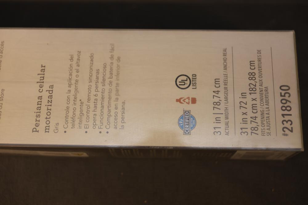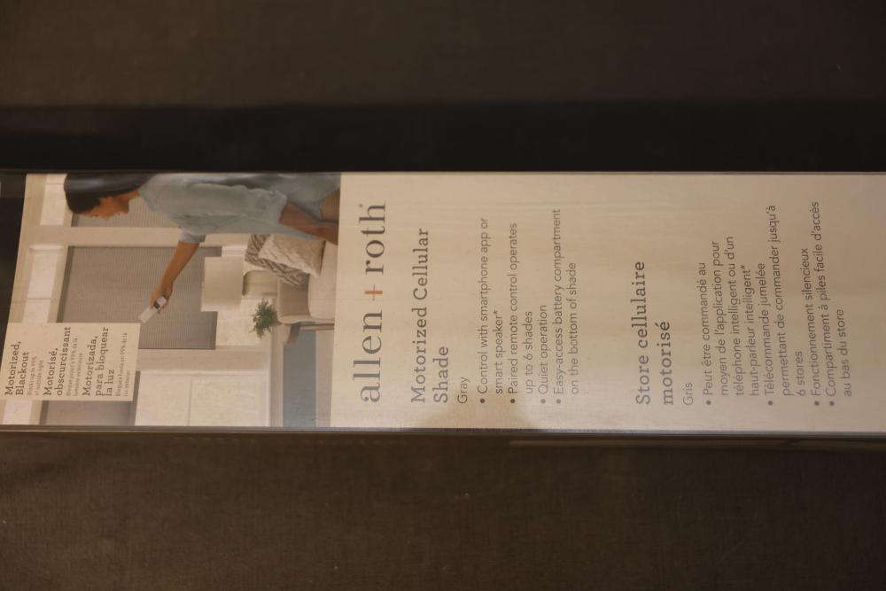 Allen + Roth Motorized Cellular Shades 31 x 72 Inches, Gray. Features smart-home app control and cordless remote operation for convenience. Offers quiet functionality and exceptional battery compatibility with a removable battery charger. Pickup only.