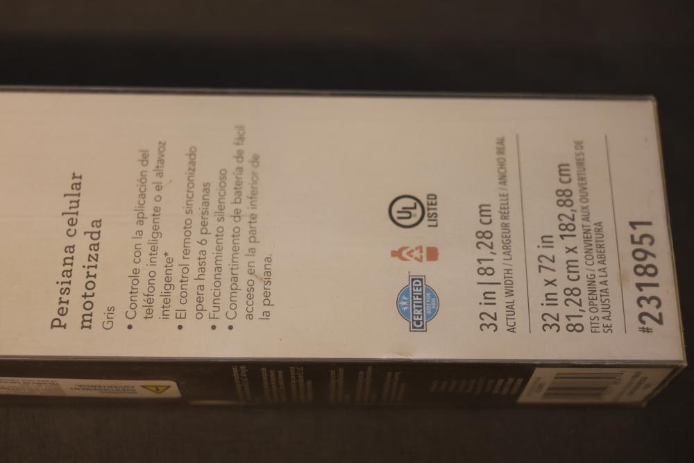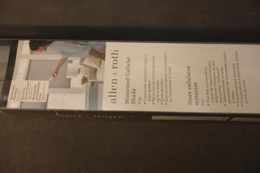 Allen + Roth Motorized Cellular Shade 32 in x 72 in Gray. Features include smartphone app compatibility, remote control for up to 6 shades, and energy efficiency. Actual width is 32 inches, and the shade size is 32 inches by 72 inches. Pickup only.