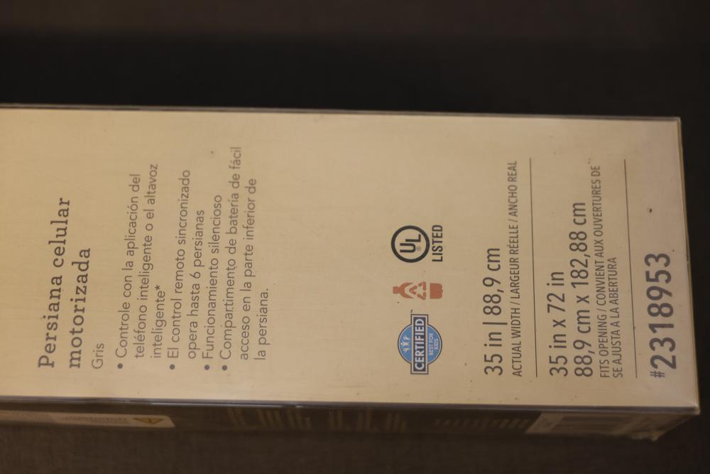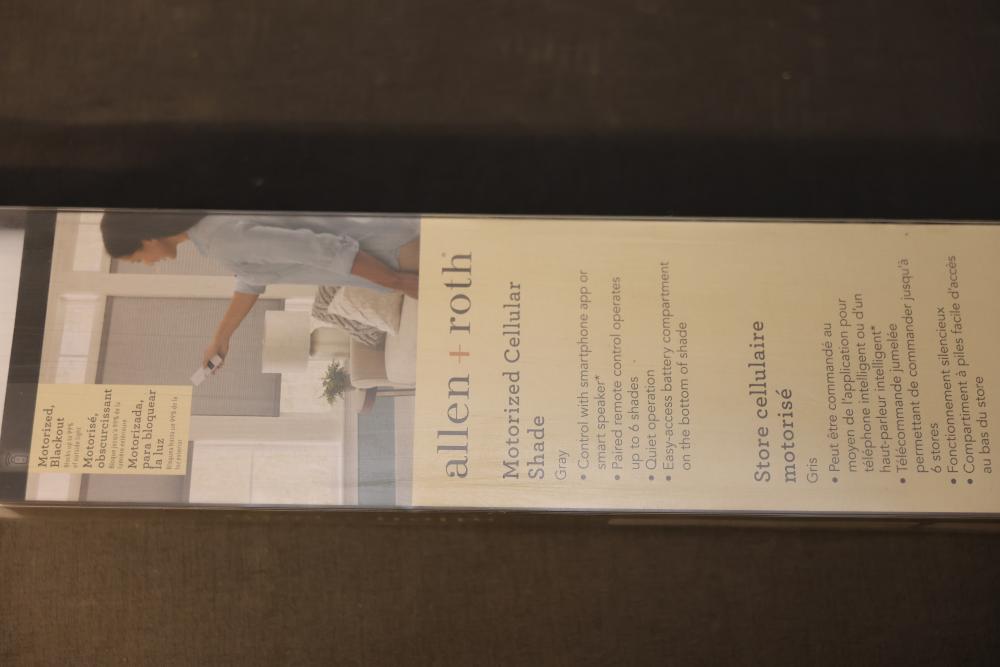 Allen + Roth Motorized Cellular Shade 35 in x 72 in Gray. Features include compatibility with smartphone apps and smart hubs, single-channel remote support, and energy-efficient functionality. Shade comes with an easy-to-access battery compartment at the bottom. Pickup only.