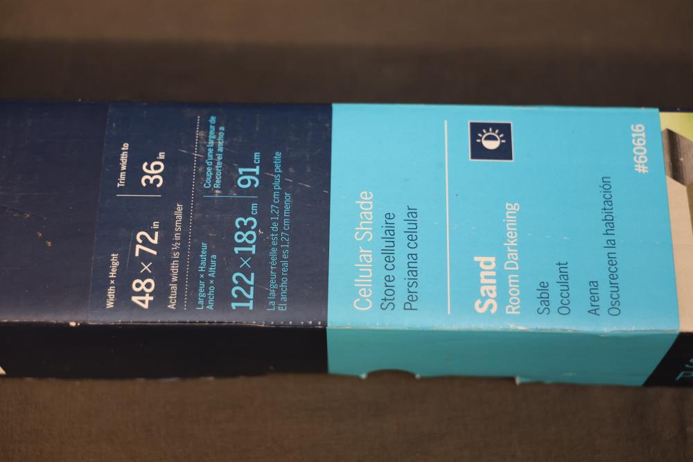 Levolor Trim+Go Sand Cellular Shades 48x72 Inch Set of 2. These room-darkening shades feature a cellular design, measuring 48 inches in width and 72 inches in height, with a trim width of up to 36 inches. Designed for light control and energy efficiency. Pickup only.
