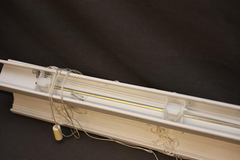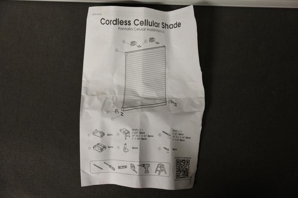 Cordless Cellular Shade with Mounting Hardware. Includes components and instruction manual for assembly. Features a durable design with pull cords and brackets. Pickup only.