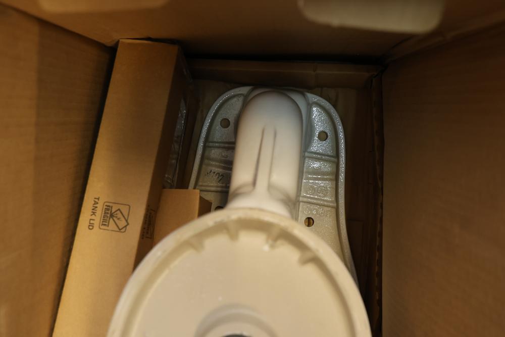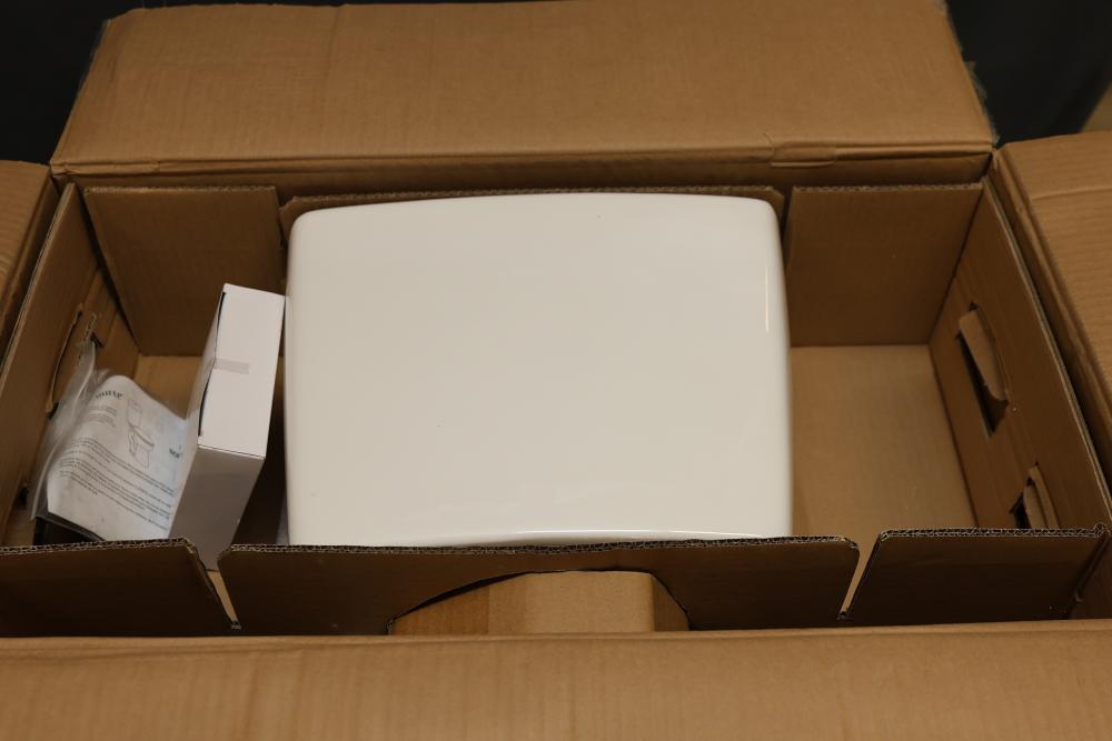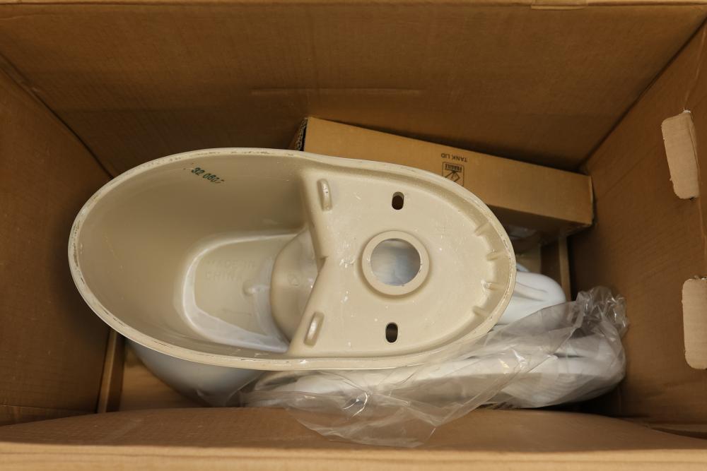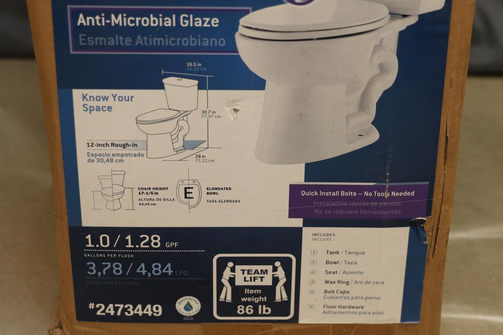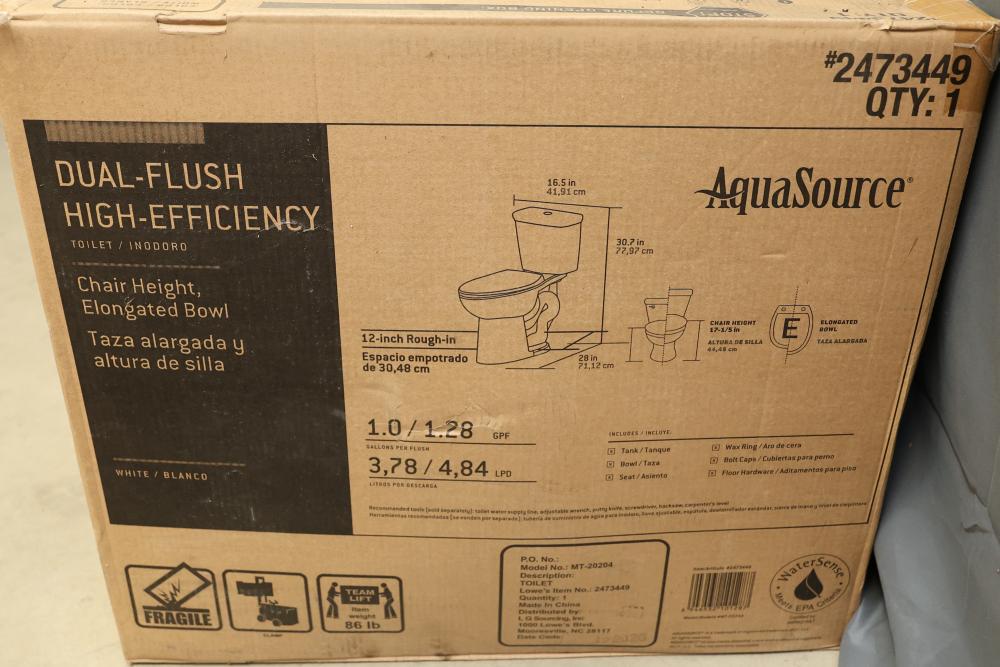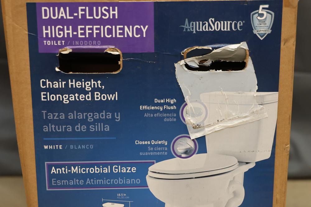 AquaSource Dual-Flush High-Efficiency Toilet, Chair Height, Elongated Bowl. Features dual-flush functionality, anti-microbial glaze for cleanliness, and a 1.0/1.28 GPF water efficiency. Includes components necessary for installation. Item weighs approximately 86 lbs and is white in color. Outer packaging shows signs of wear. Pickup only.