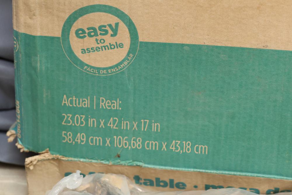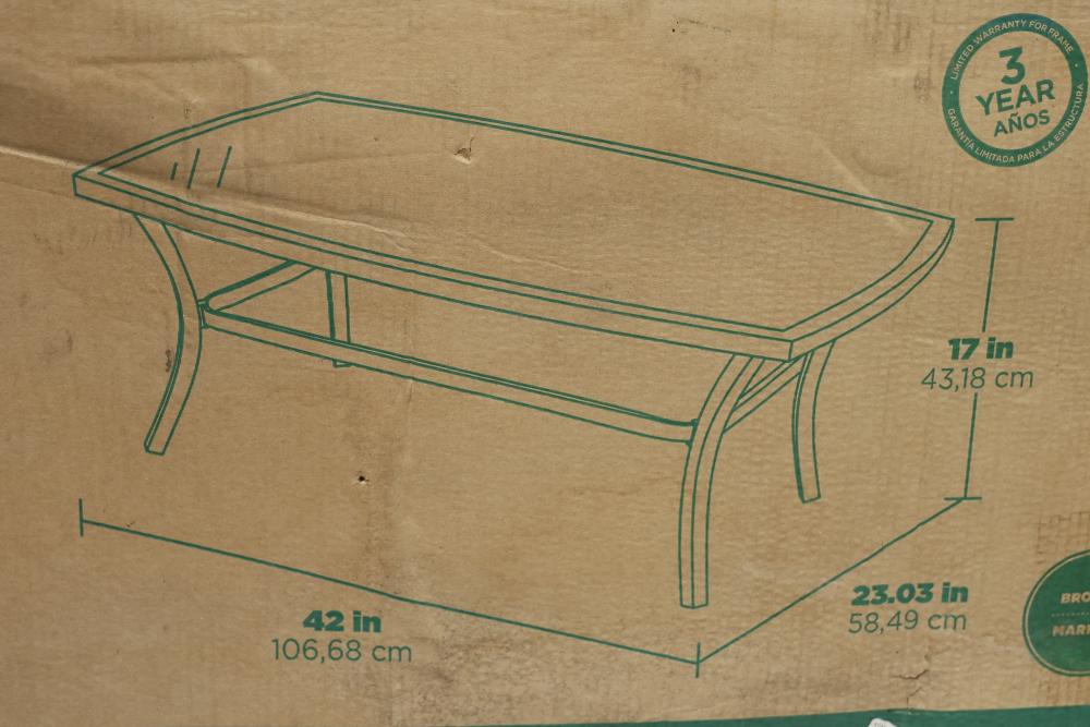 Garden Treasures Coffee Table with Glass Top and Metal Frame. Measures 23.03 in x 42 in x 17 in (58.49 cm x 106.68 cm x 43.18 cm). Easy to assemble. Box shows signs of wear, but the contents appear unused and are still in original packaging. Pickup only.