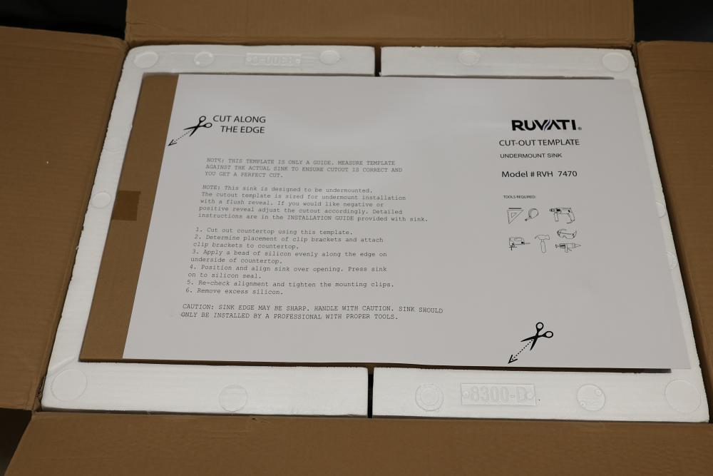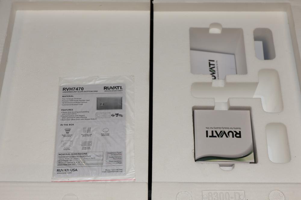 Ruvati RVH7470 Stainless Steel Undermount Kitchen Sink. Features include heavy-duty stainless steel construction, soundproofing technology, and a modern brushed finish. Includes all original packaging, cut-out template, and mounting hardware. Pickup only.