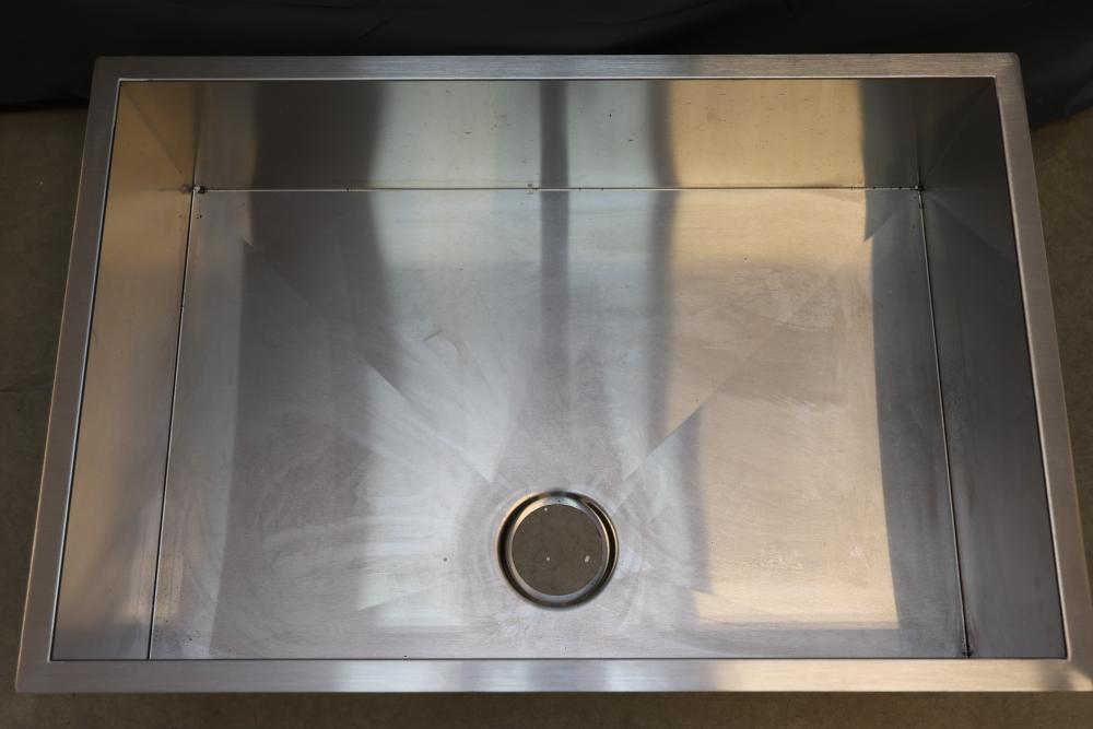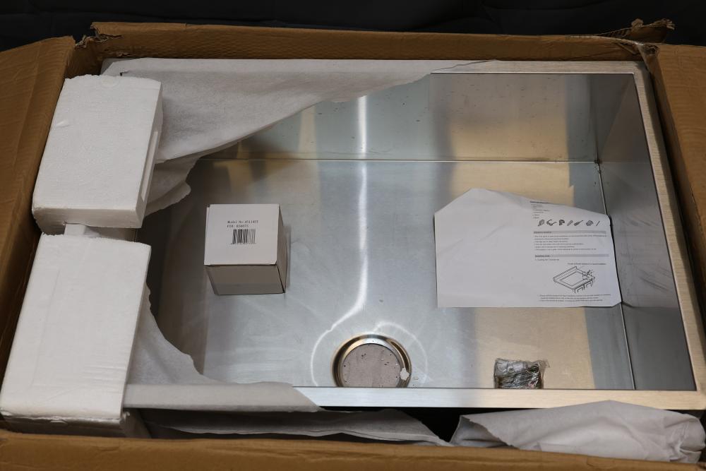 Stainless Steel Undermount Kitchen Sink with Accessories. Includes installation instructions, mounting hardware, and additional component box. The sink appears to be unused but comes in an opened and slightly damaged box. Model No: AS114ST, PID: KS0073. Pickup only.