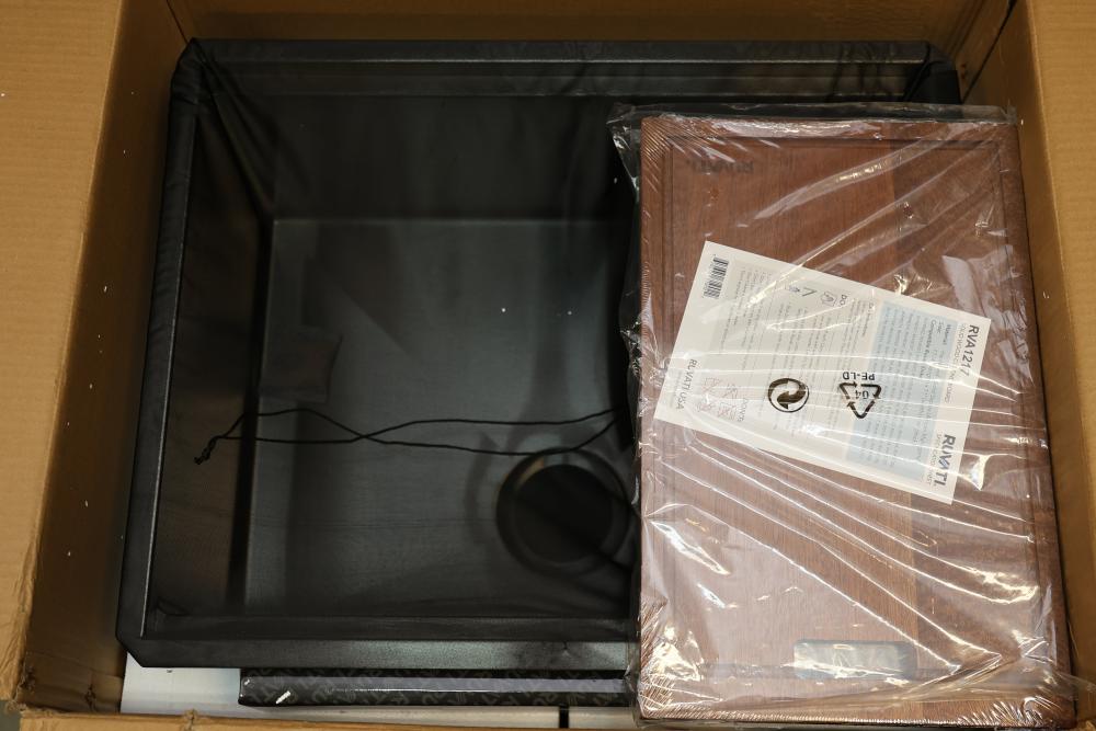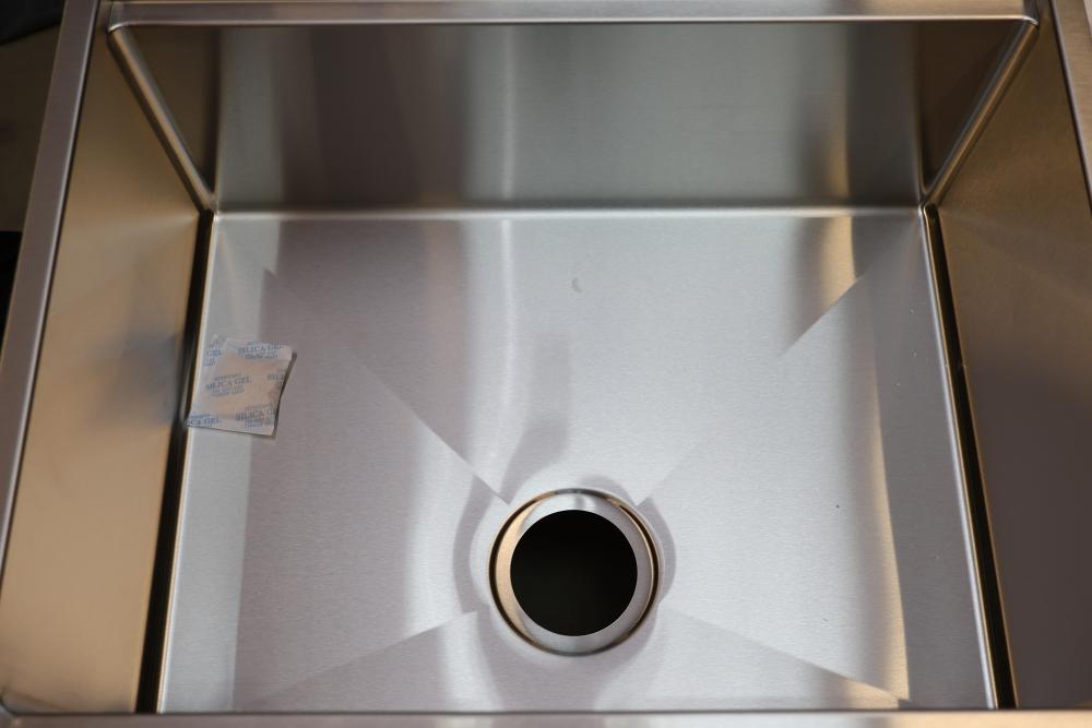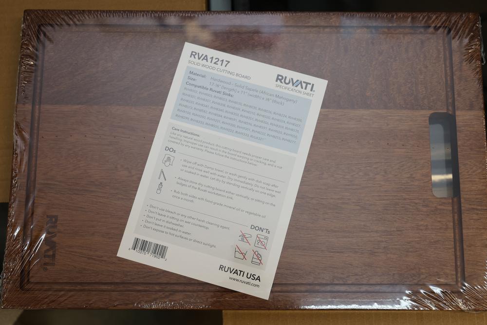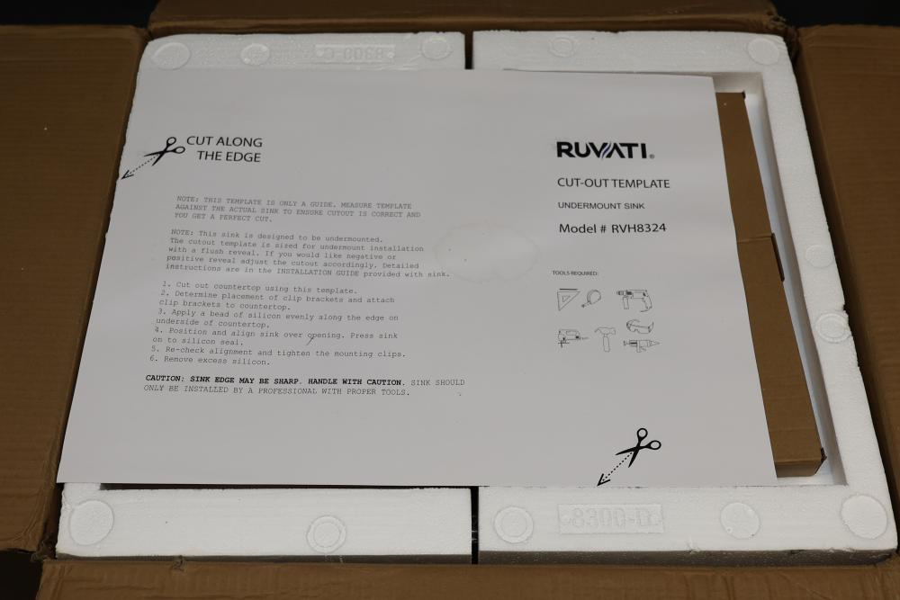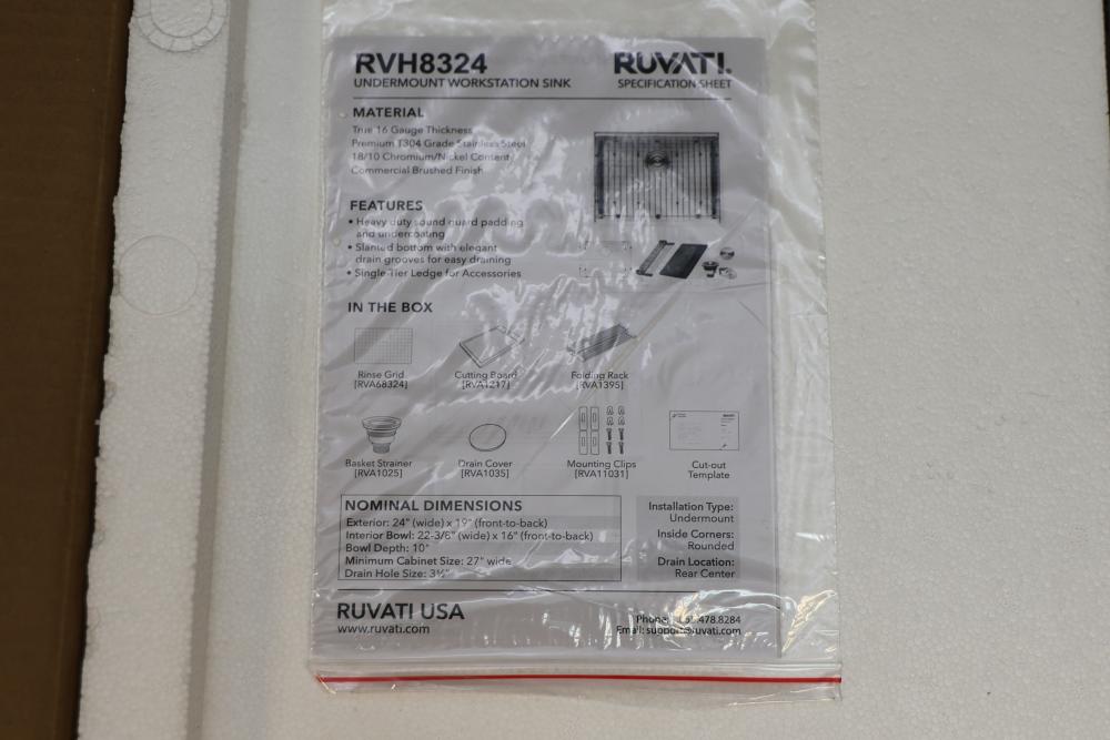 Ruvati RVH8324 Undermount Workstation Sink with Accessories. Includes undermount sink, cut-out template, and accessories such as a wooden cutting board and soap dispenser. Made of stainless steel and designed for durability and functionality. Packaged in original box with instructions and protective materials. Pickup only.