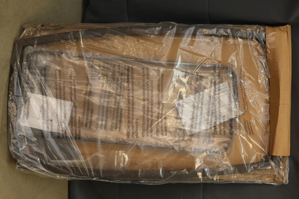 Garden Treasures Coffee Table with Glass Top and Hardware. Includes a glass tabletop, metal frame, and assembly hardware. The item is new and comes in original packaging, though the box shows some wear. Features a one-year limited warranty as indicated on the packaging. Pickup only.