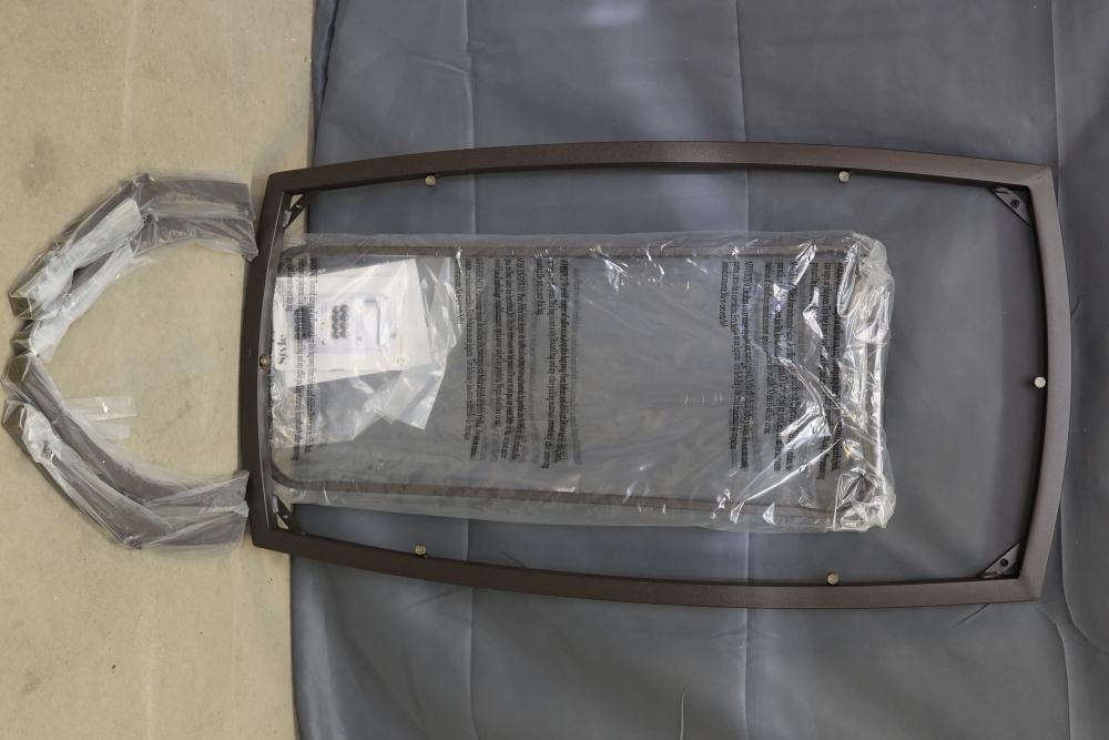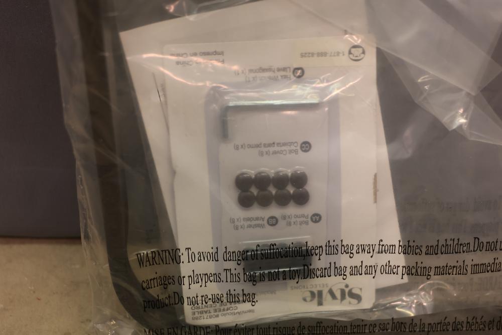 Valleydale Coffee Table with Glass Top and Metal Frame Components. Includes a glass top, metal frame with hardware, and packaged assembly components. The unit is in original packaging. Pickup only.