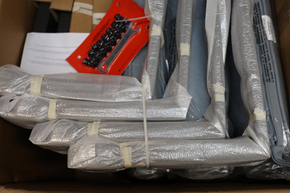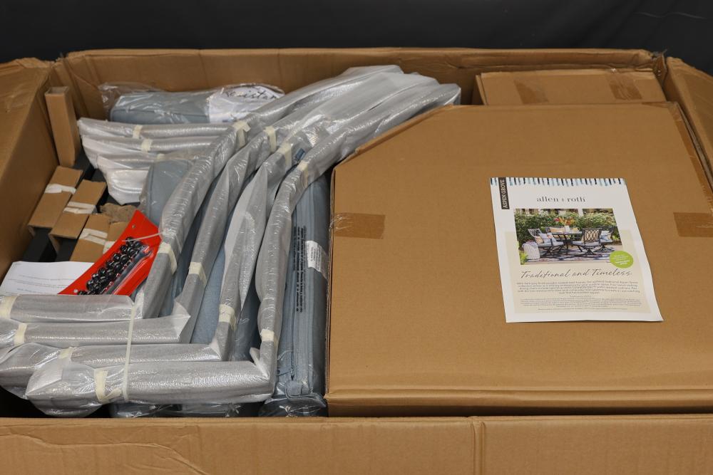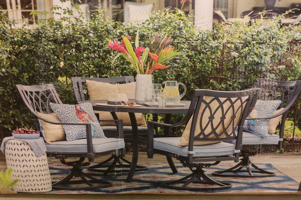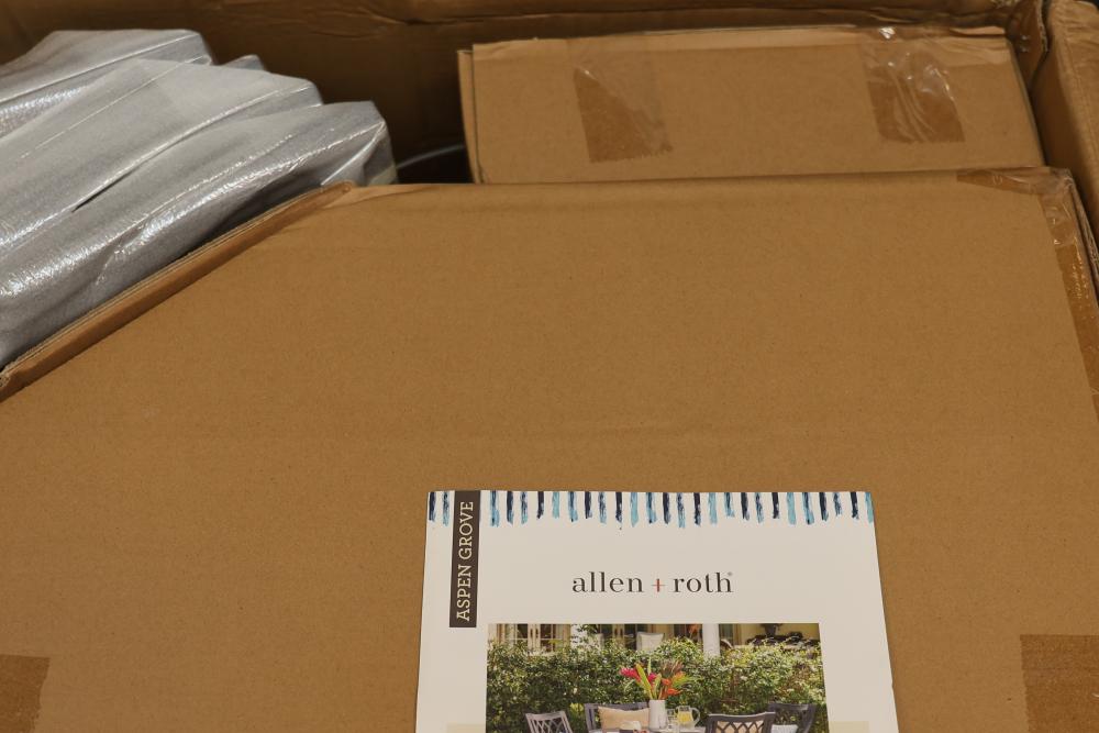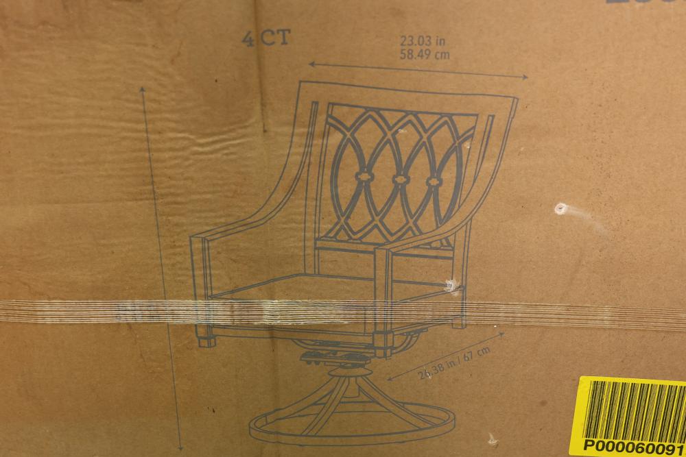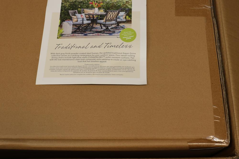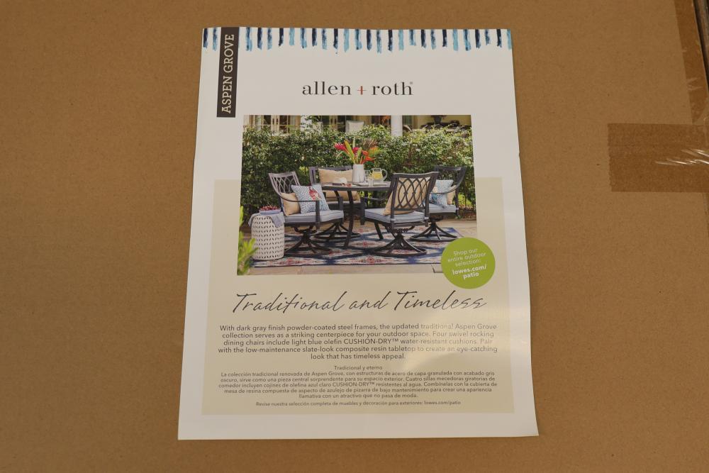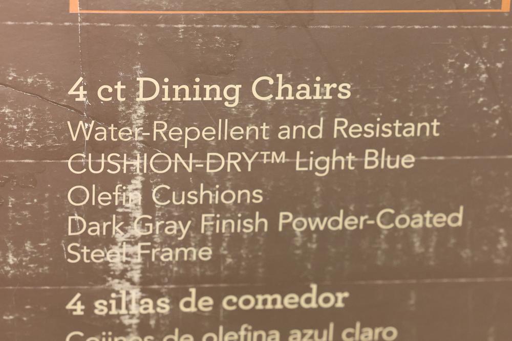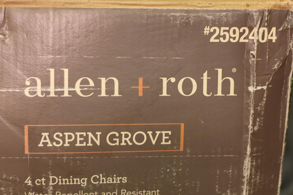 Allen + Roth Aspen Grove 4-Piece Dining Chair Set With Cushions. Features water-repellent and resistant CUSHION-DRY light blue olefin cushions with a dark gray finish powder-coated steel frame. Chairs measure 23.03 inches in width and accommodate comfortable outdoor dining. Pickup only.