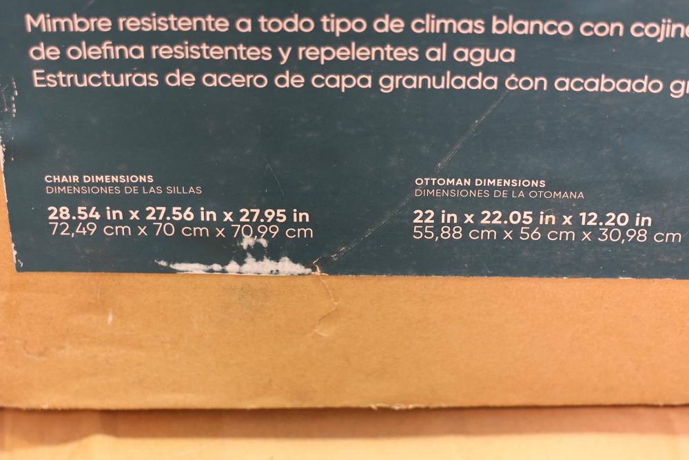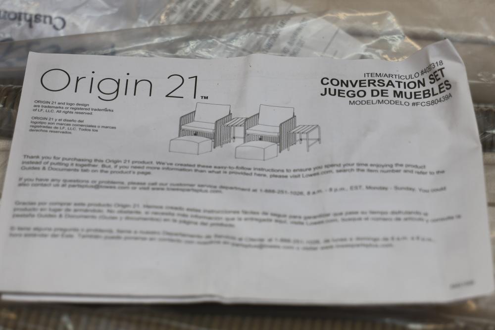 Origin 21 Vista Bluff Conversation Set with All-Weather Wicker. Includes a six-piece set with gray finish powder-coated steel frames and white water-repellent and resistant olefin cushions. Chair dimensions: 28.54 in x 27.56 in x 27.95 in. Ottoman dimensions: 22 in x 22.05 in x 12.20 in. Large table dimensions: 17.91 in x 19.69 in x 20.87 in. Small table dimensions: 17.91 in x 16.14 in x 19.09 in. Box opened, contents remain packaged. Pickup only.