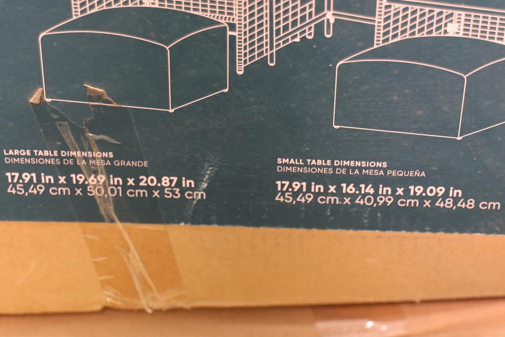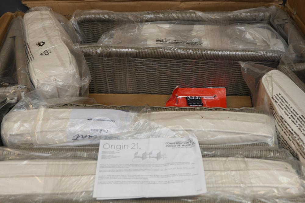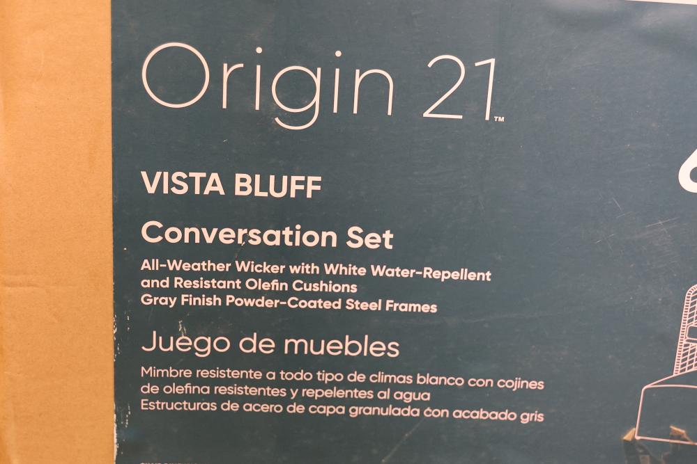 Origin 21 Vista Bluff Conversation Set with Wicker and Cushions. Includes all-weather wicker construction, white water-repellent and resistant olefin cushions, and gray finish powder-coated steel frames. Chair dimensions: 28.54 in x 27.56 in x 27.95 in. Ottoman dimensions: 22 in x 22.05 in x 12.20 in. Large table dimensions: 17.91 in x 19.69 in x 20.87 in. Small table dimensions: 17.91 in x 16.14 in x 19.09 in. Comes in original packaging. Pickup only.