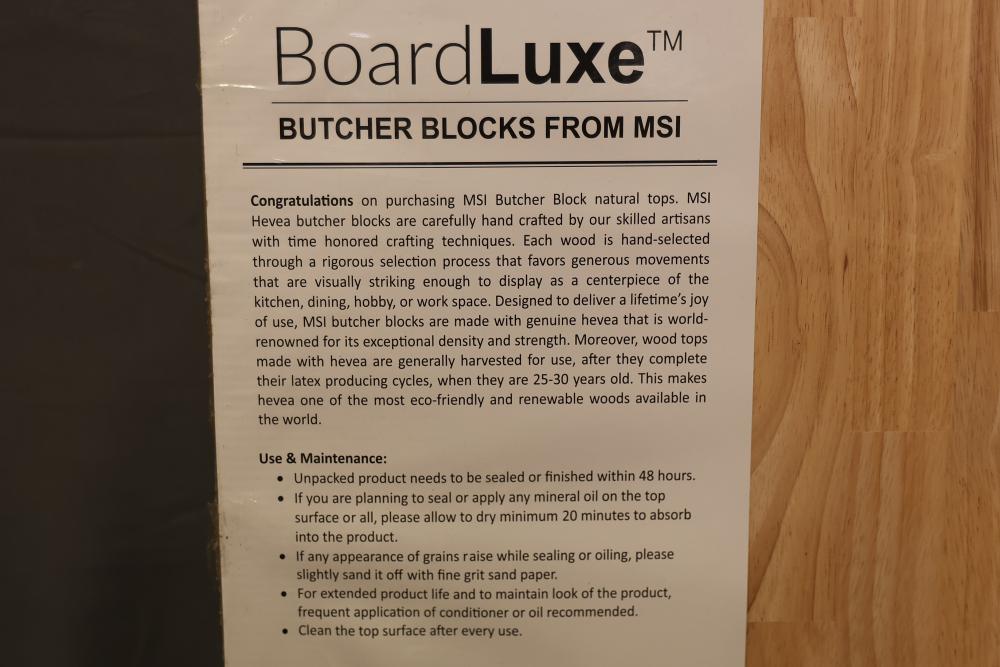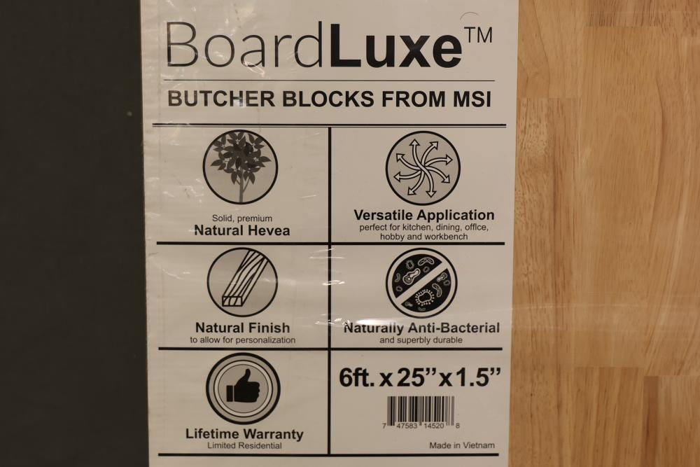 BoardLuxe Butcher Block Natural Top, 6ft x 25in x 1.5in. Made from premium natural Hevea wood with a natural finish for personalization. The surface is naturally anti-bacterial and designed for versatile applications, such as use in countertops, kitchen islands, or workbenches. Pickup only.