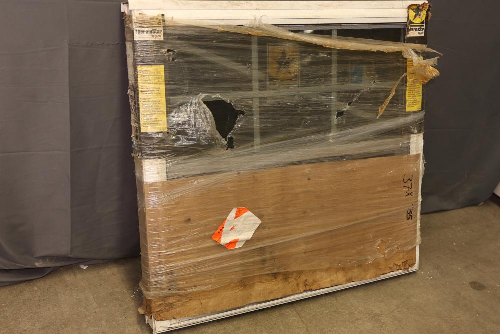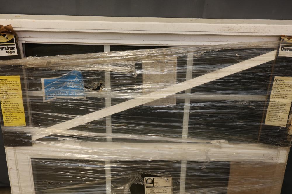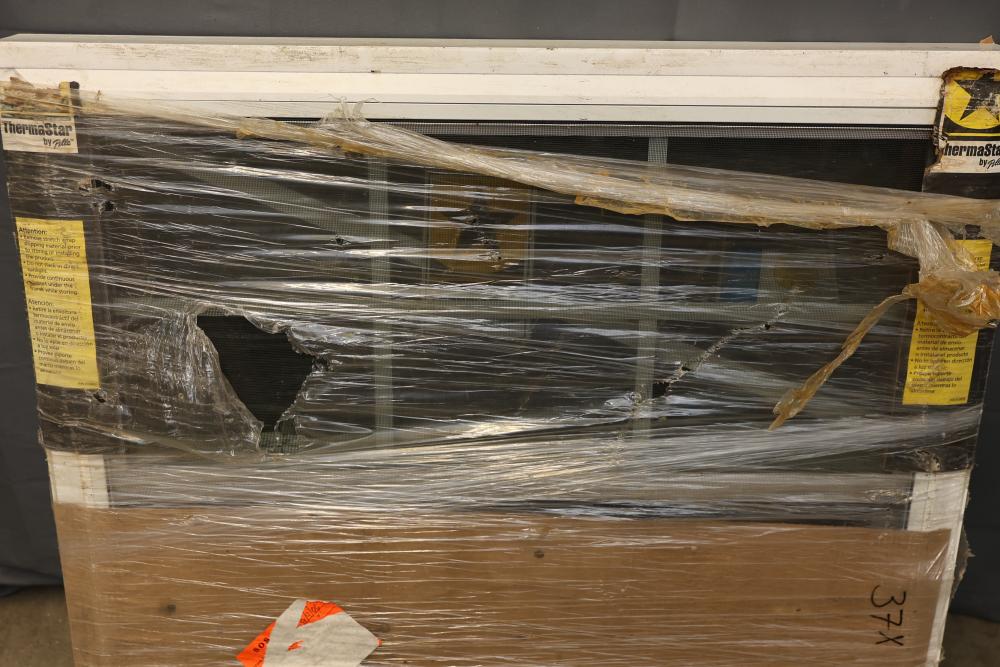 ThermaStar by Pella double-hung annealed window with one wide low-E/clear glass, certified for energy performance. Includes specific ratings for U-Factor (0.35), Solar Heat Gain Coefficient (0.27), and Visible Transmittance (0.45). The item is wrapped in plastic and exhibits visible damage, including a broken section. Pickup only.