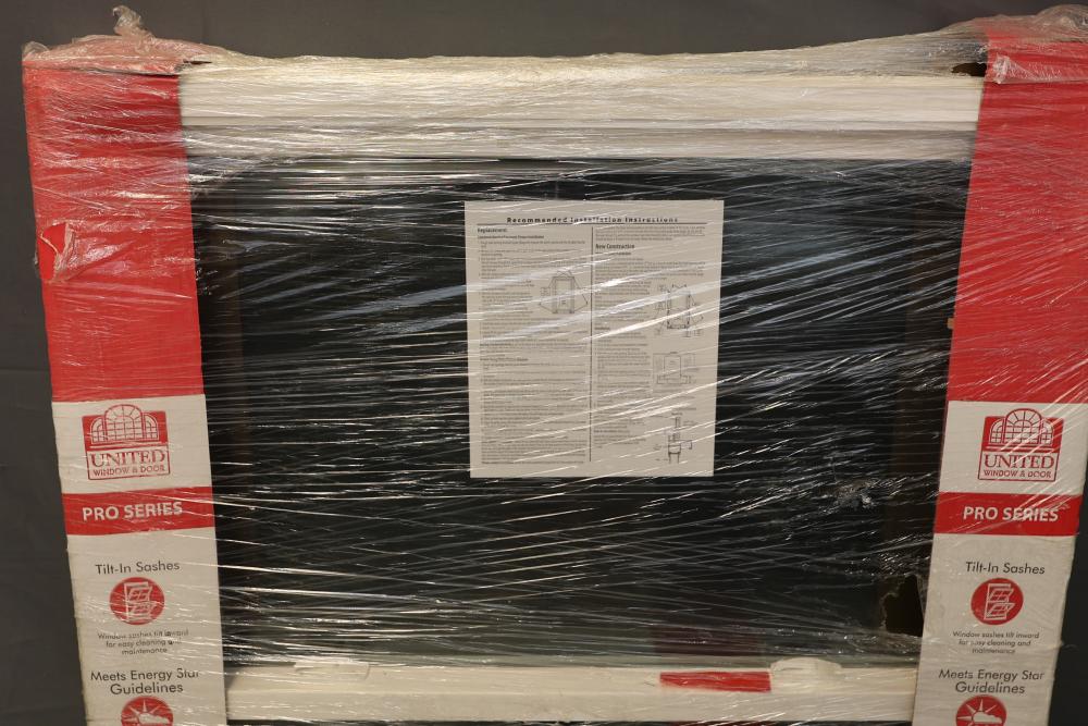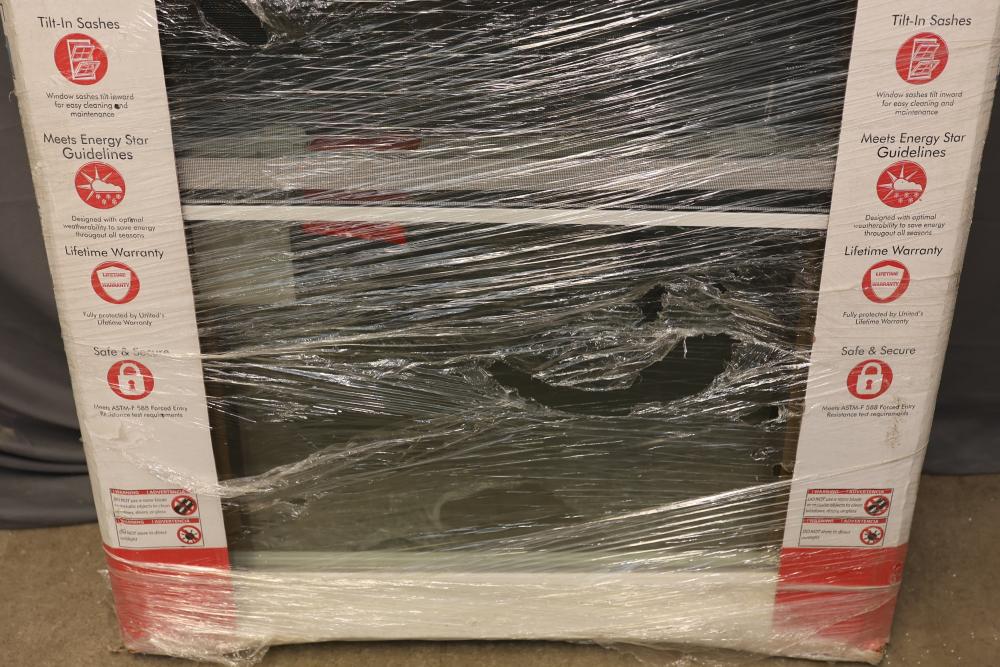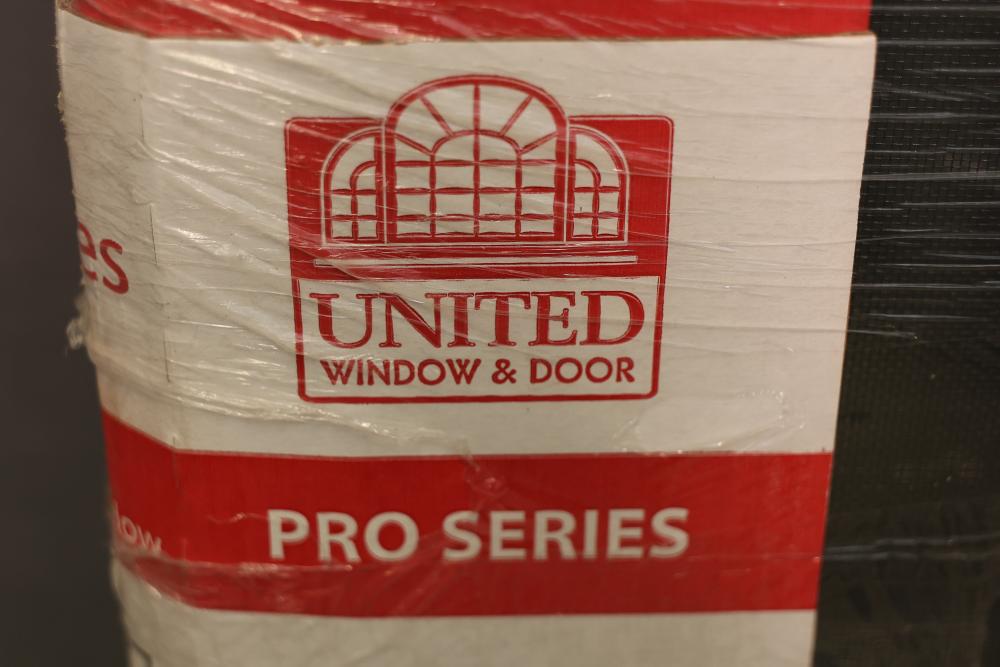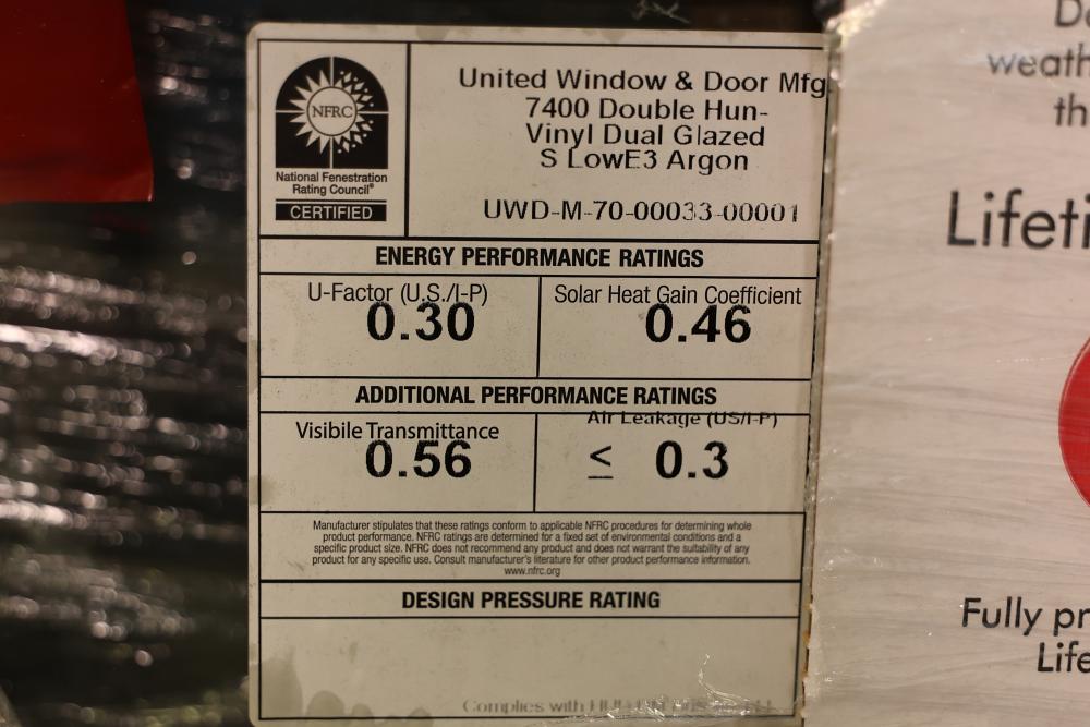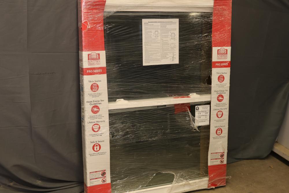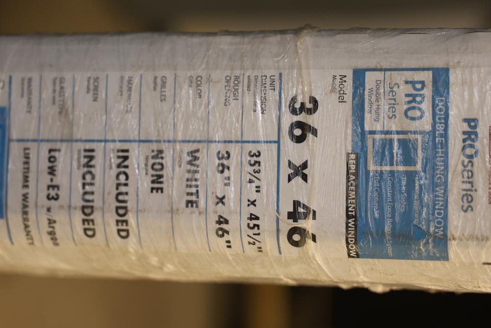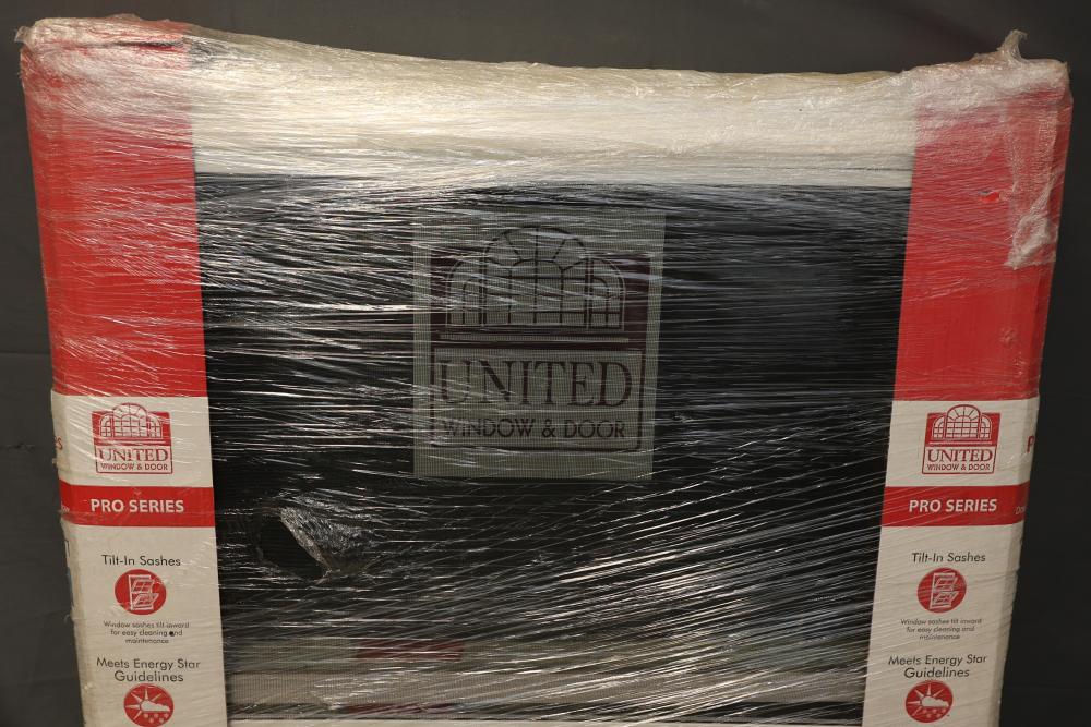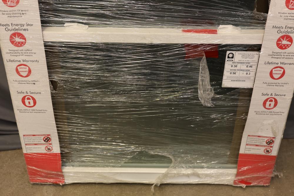 United Window & Door Pro Series 36 x 46 Double-Hung Window featuring vinyl frame construction, dual-glazed Low-E3 Argon glass, and a white finish. Includes screen and grilles. Energy performance details include a U-Factor of 0.30 and Solar Heat Gain Coefficient of 0.46. Measures 35 3/4" x 45 1/2" for rough opening. Lifetime warranty included. Pickup only.