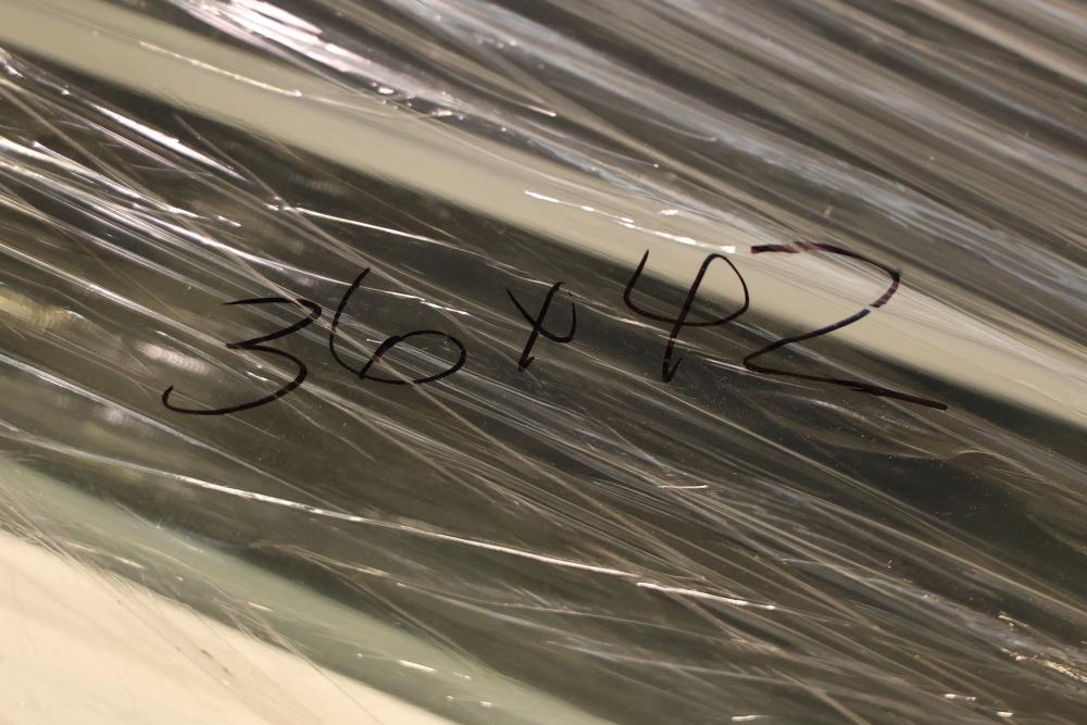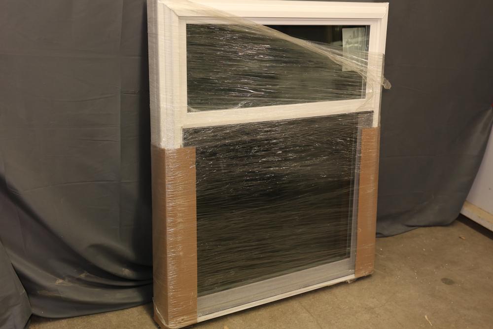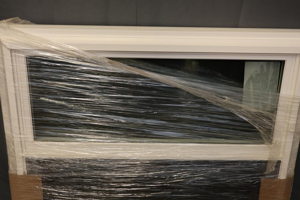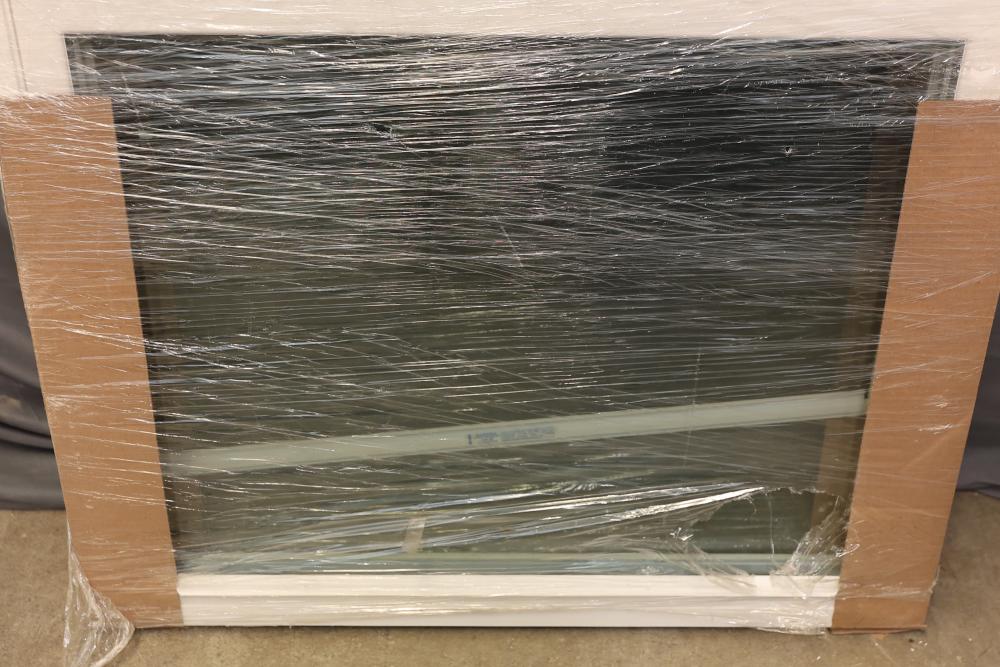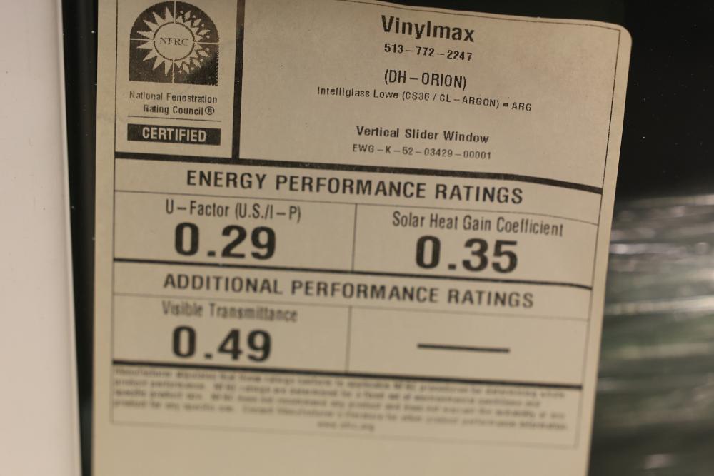 Vinylmax vertical slider window measuring 36x42 inches. Features energy performance ratings with a U-Factor of 0.29, Solar Heat Gain Coefficient of 0.35, and Visible Transmittance of 0.49. Labeled as DH-Orion and IntelliglassLowE (SB70XL-ANSI-Clear). Pickup only.
