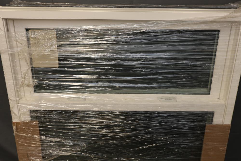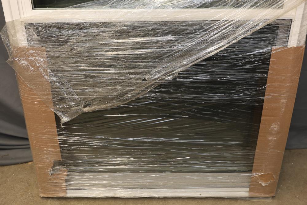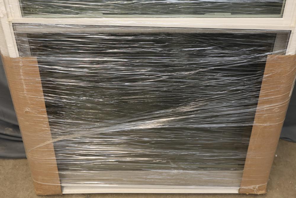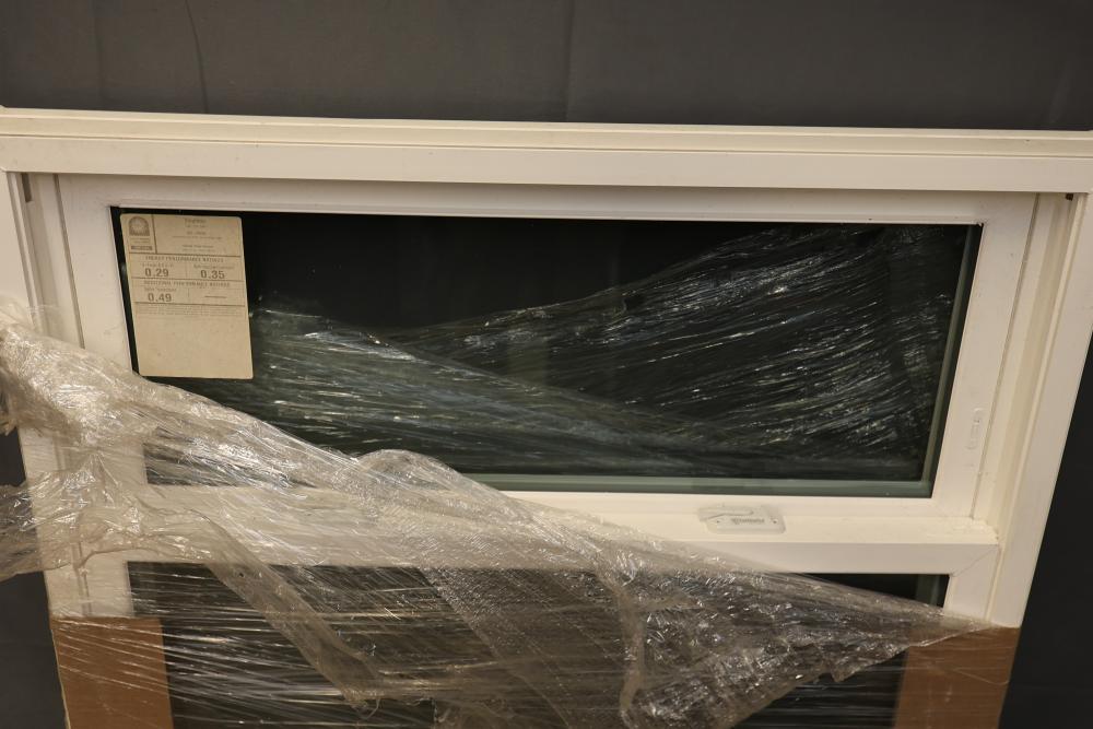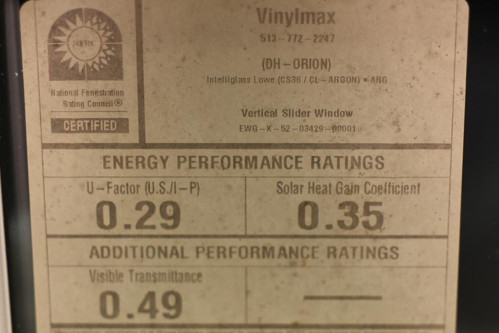Vinylmax Vertical Slider Windows with Energy Performance Ratings. Includes a set of windows with a white frame design and transparent glass construction. The label specifies U-Factor of 0.29, Solar Heat Gain Coefficient of 0.35, and Visible Transmittance of 0.49 for optimal energy efficiency. Packaged with protective wrapping. Pickup only.