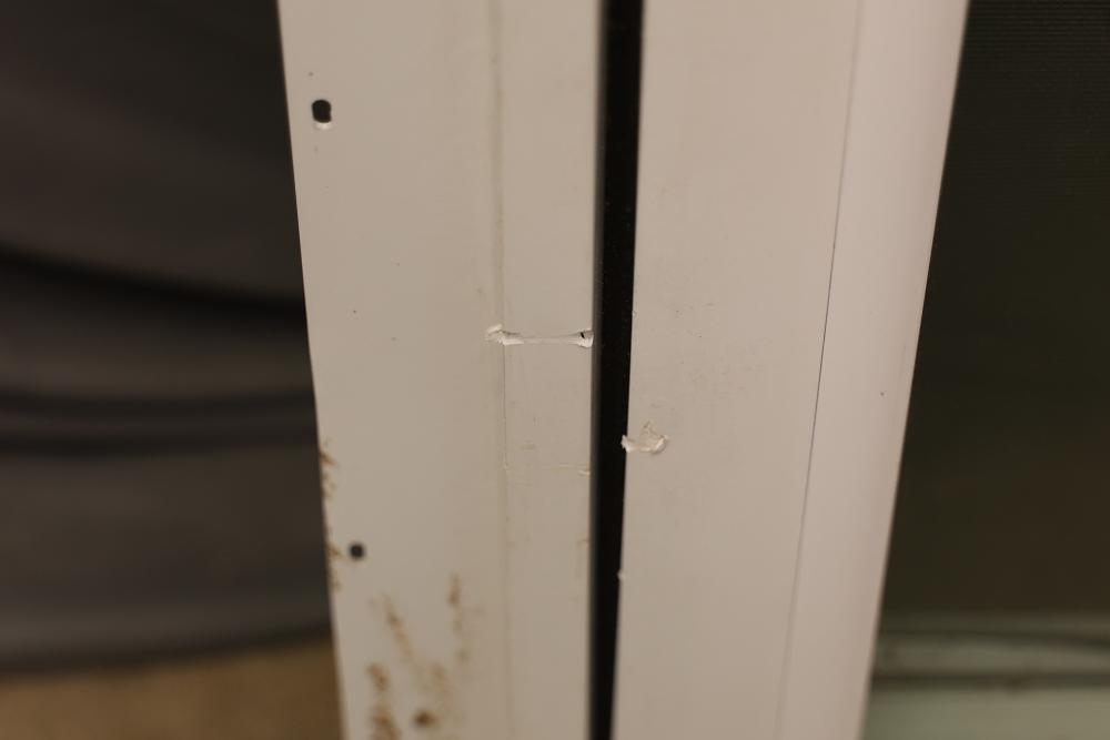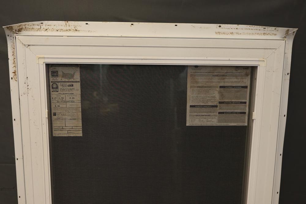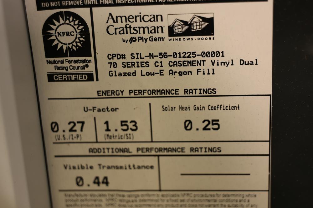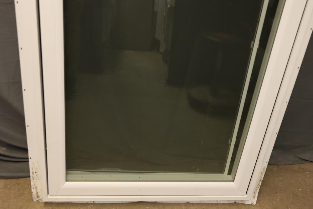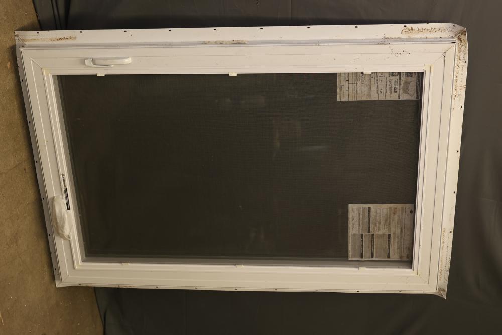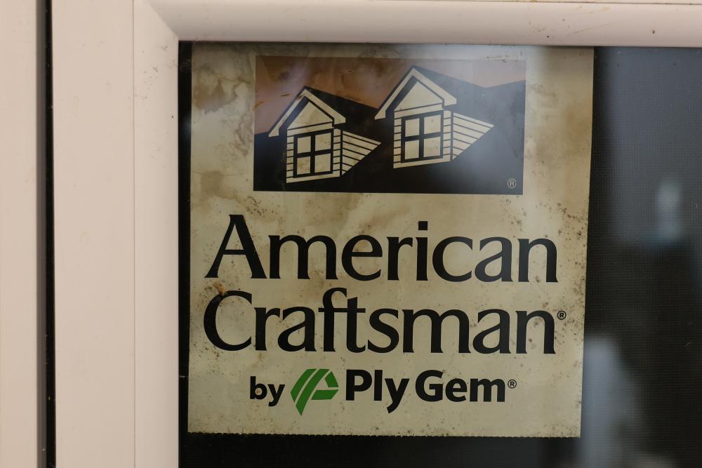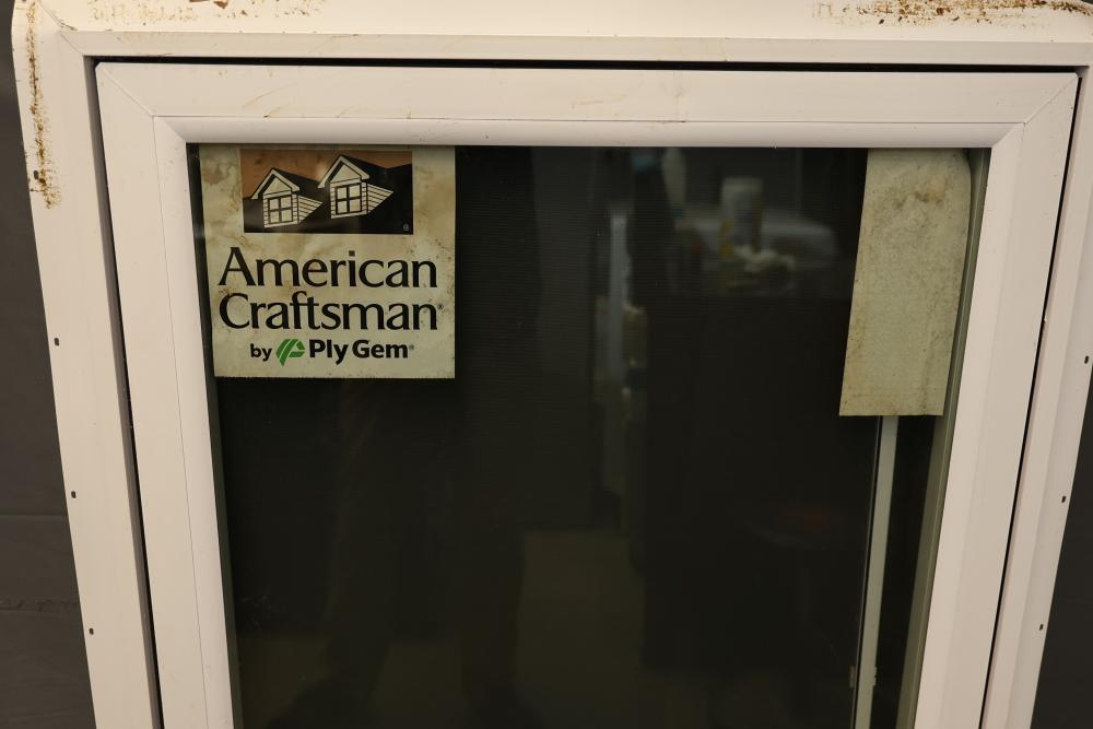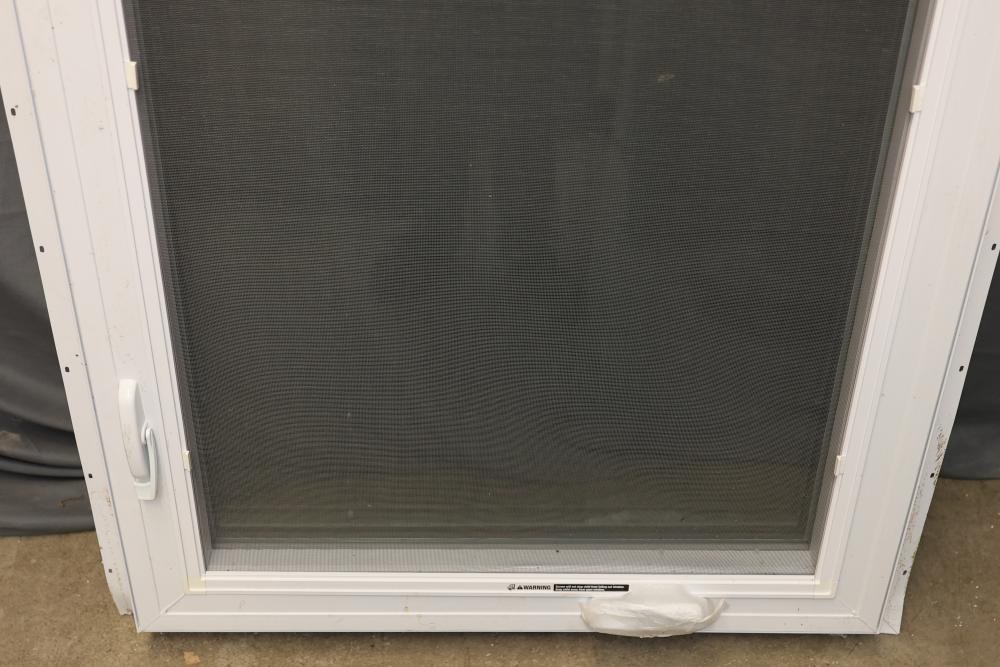 American Craftsman By Ply Gem Vinyl Casement Window With Screen. Features dual-glazed low-E argon fill glass, a white vinyl frame, and an integrated side handle. The window is part of the 70 Series, as indicated by the manufacturer's labeling. Signs of wear and surface marks are visible on the frame. Pickup only.