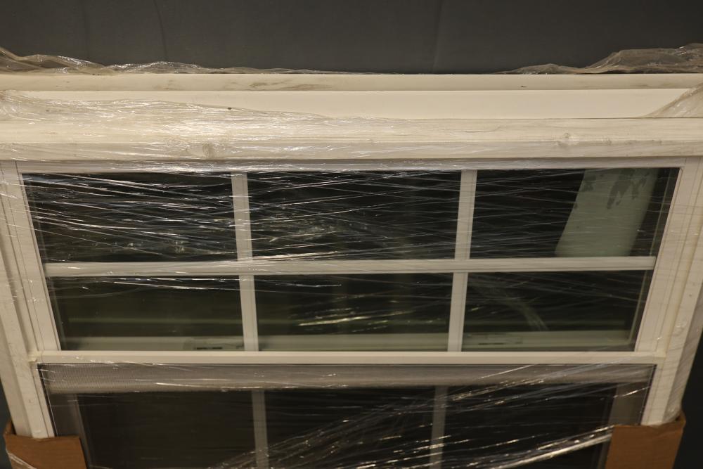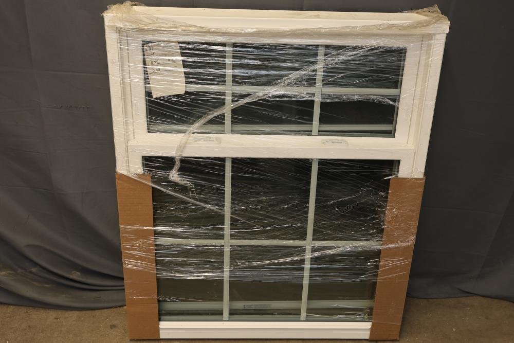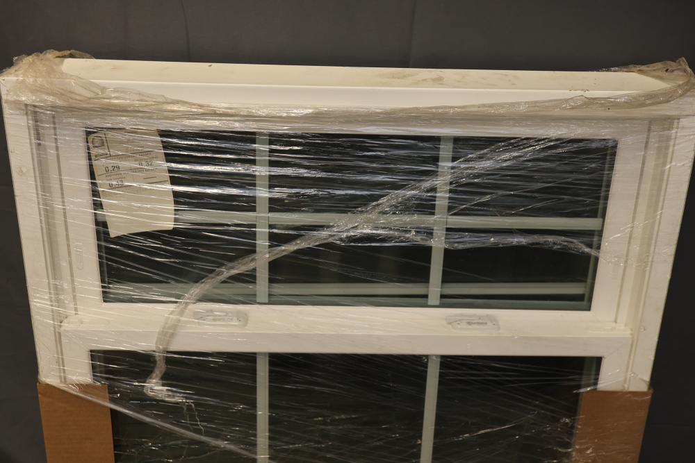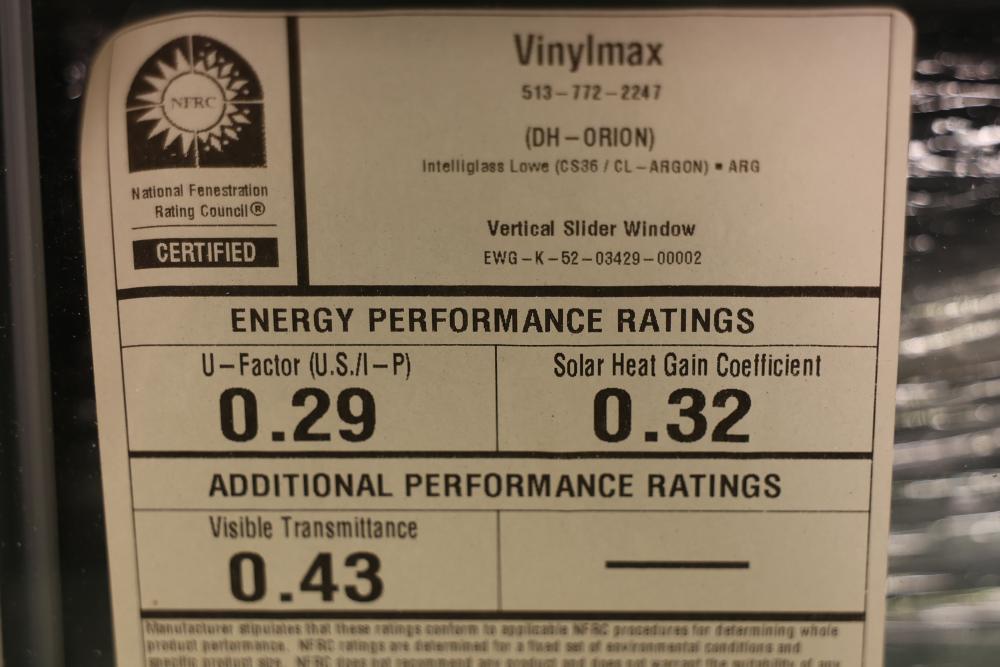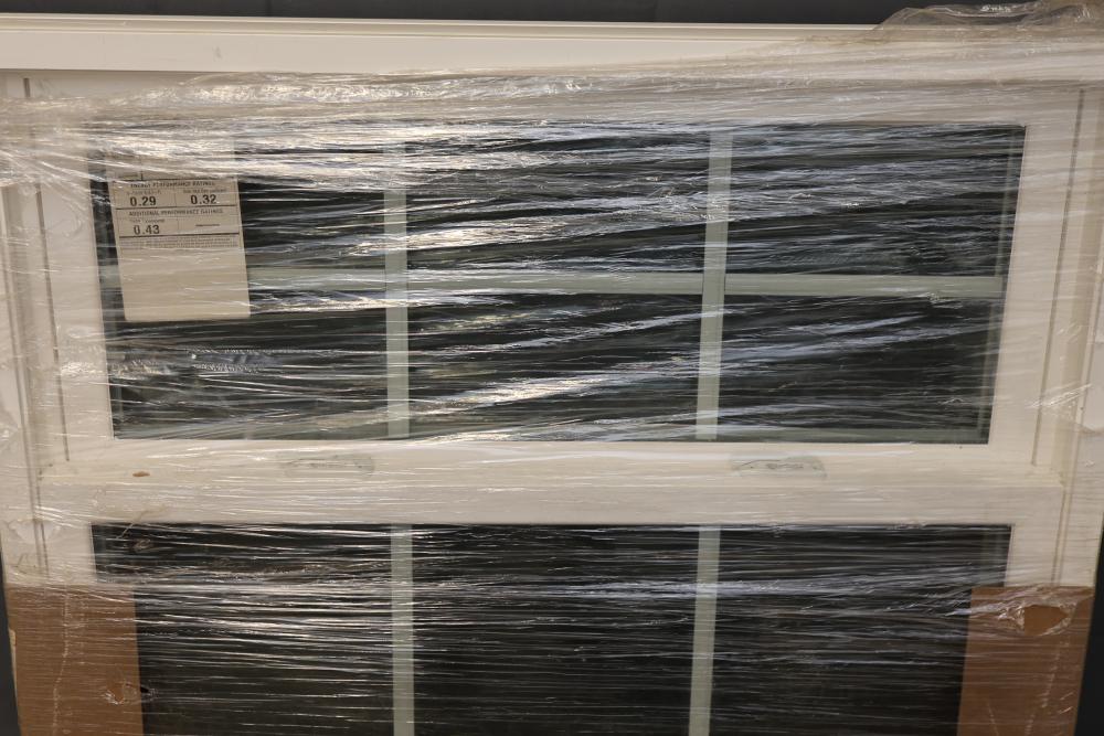 Vinylmax vertical slider windows with certified energy performance ratings, including U-Factor of 0.29, Solar Heat Gain Coefficient of 0.32, and Visible Transmittance of 0.43. Features 6 over 6 grid style, double-pane glass, and white frame. Factory-sealed with minimal handling wear. Pickup only.
