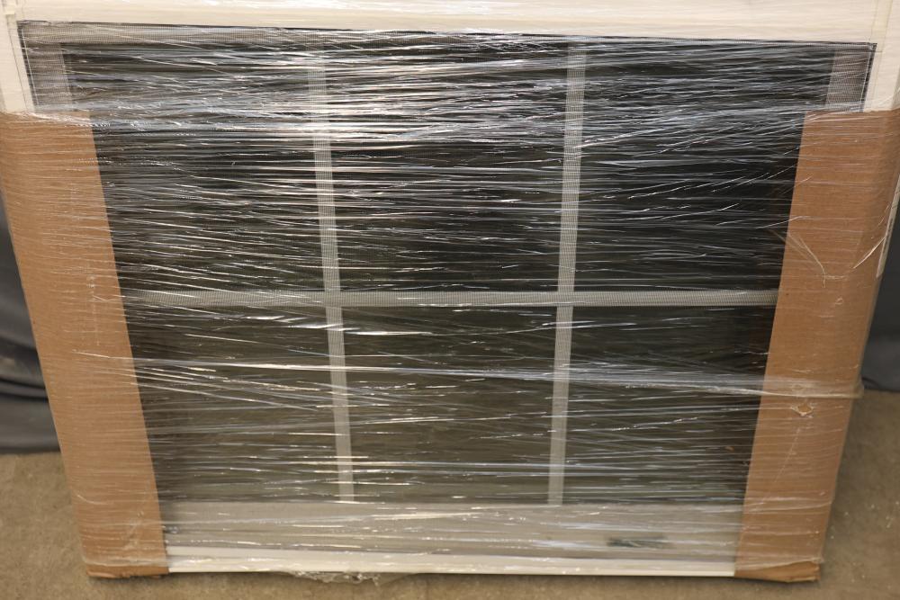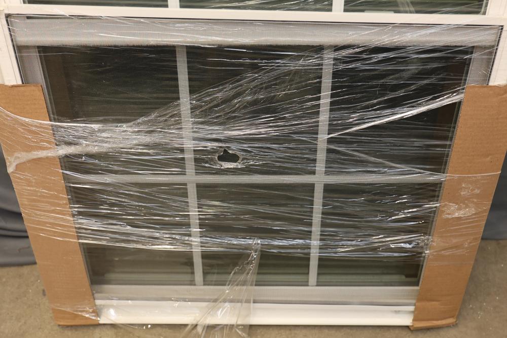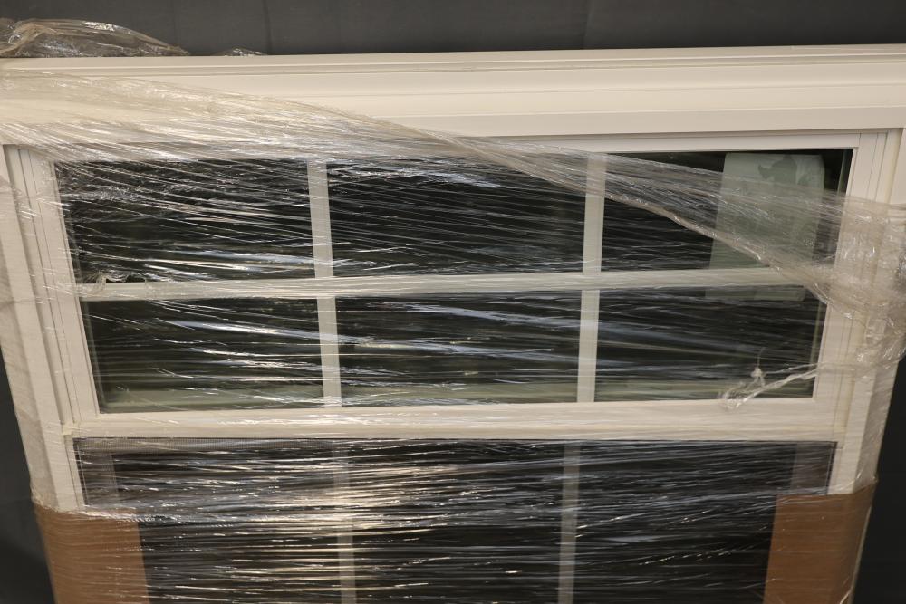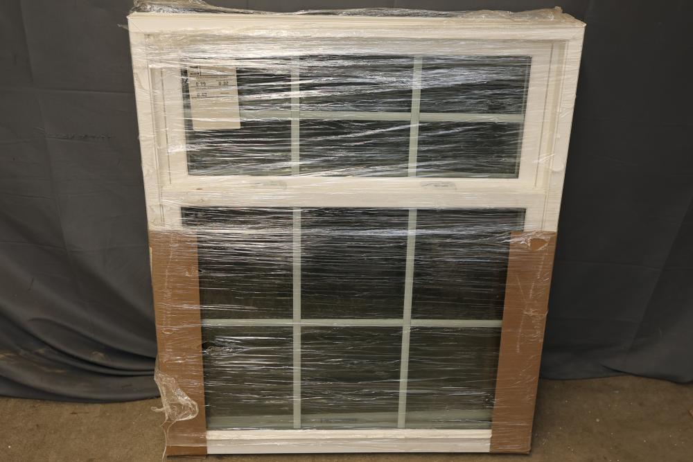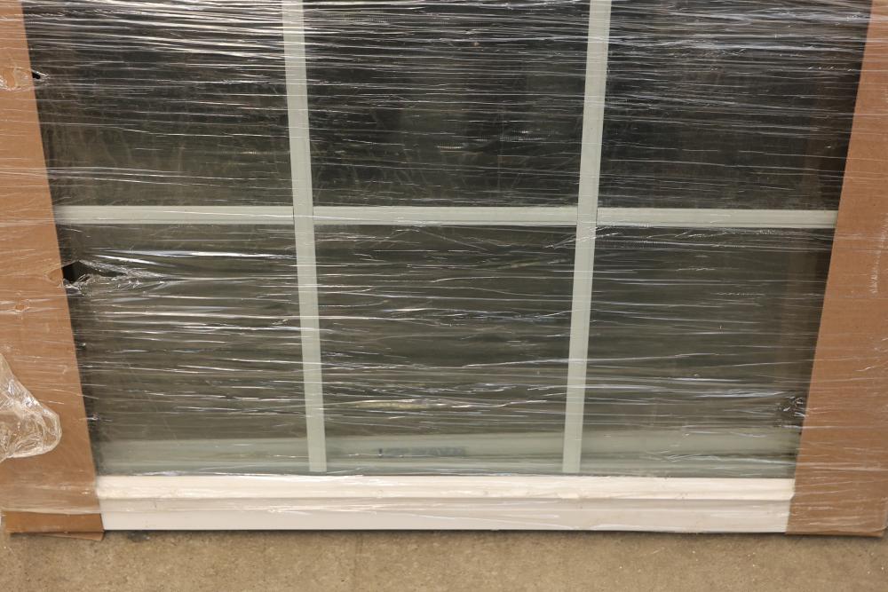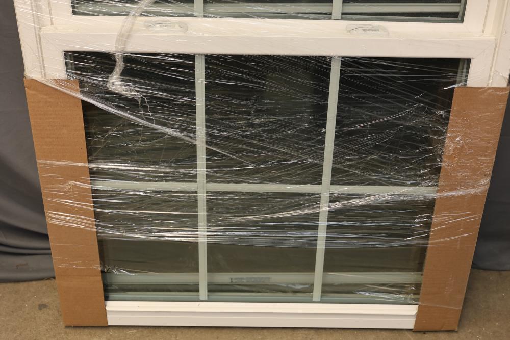 Vinylmax vertical slider windows with certified energy performance ratings, including U-Factor of 0.29, Solar Heat Gain Coefficient of 0.32, and Visible Transmittance of 0.43. Features 6 over 6 grid style, double-pane glass, and white frame. Factory-sealed with minimal handling wear. Pickup only.