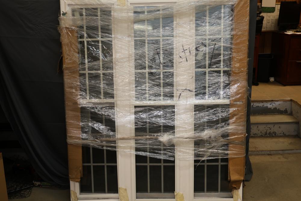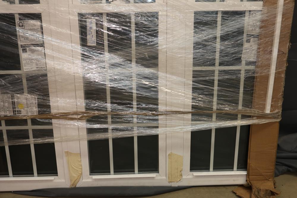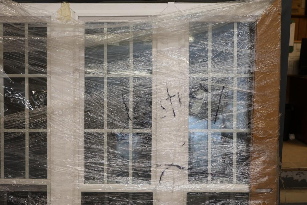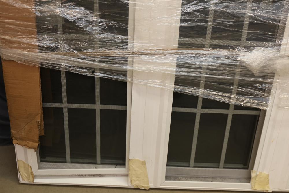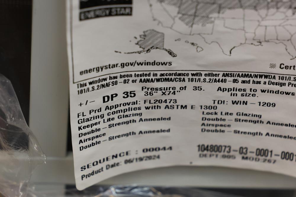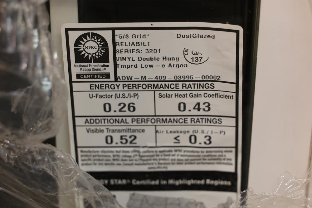 Vinyl Double Hung Dual Glazed Window Set with Energy Performance Ratings. Features 5/8-inch grid design, dual glazing, tempered low-e argon. Labeled as Series 3201, this set includes ENERGY STAR certification with U-Factor of 0.26 and Solar Heat Gain Coefficient of 0.43. Dimensions provided on the label are 36 inches by 74 inches. Pickup only.