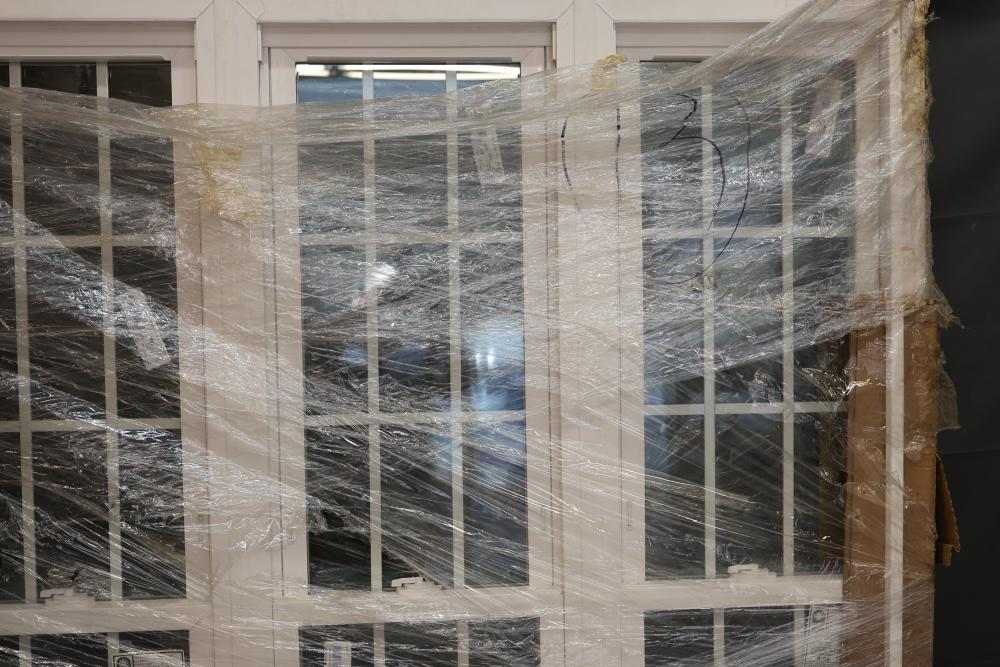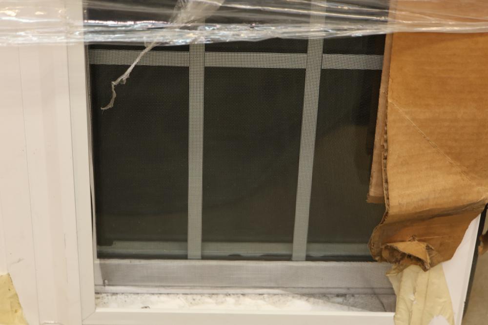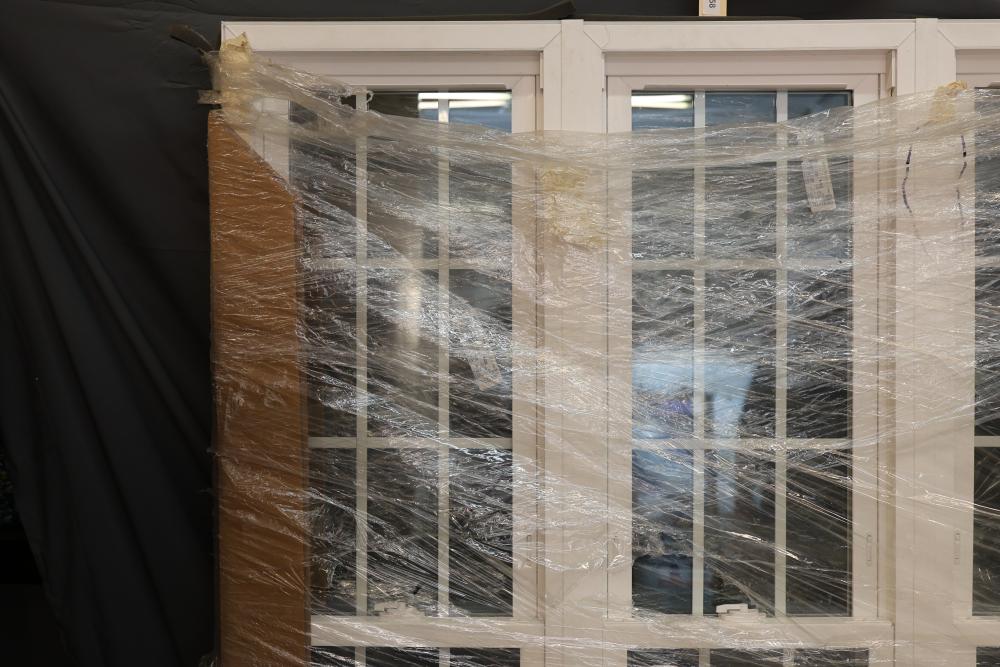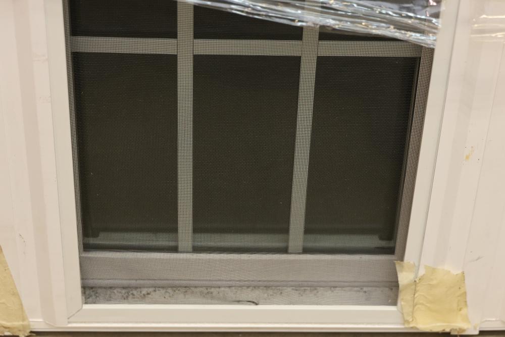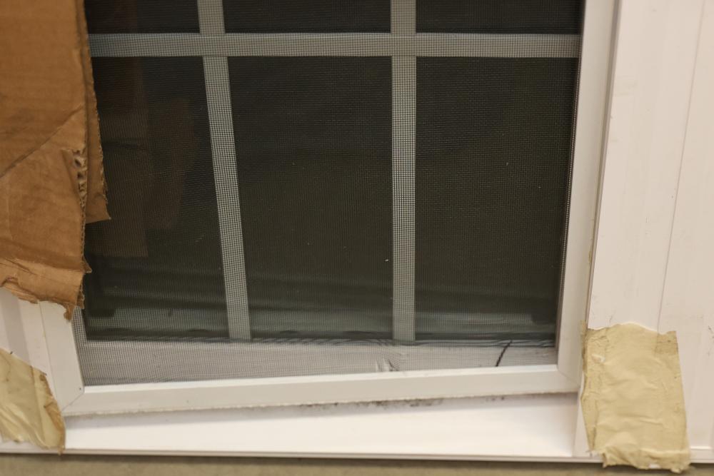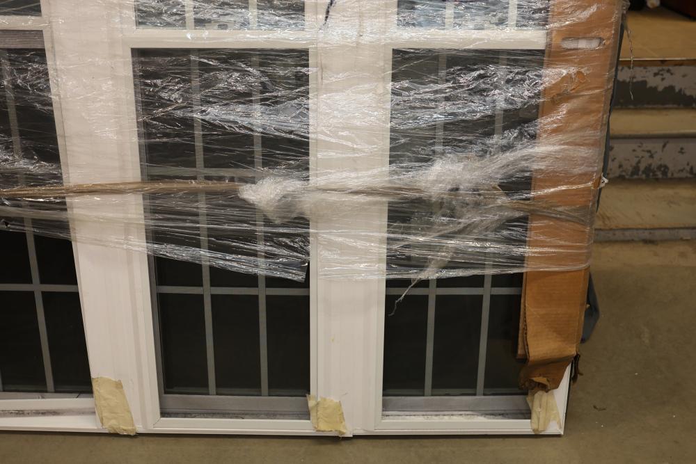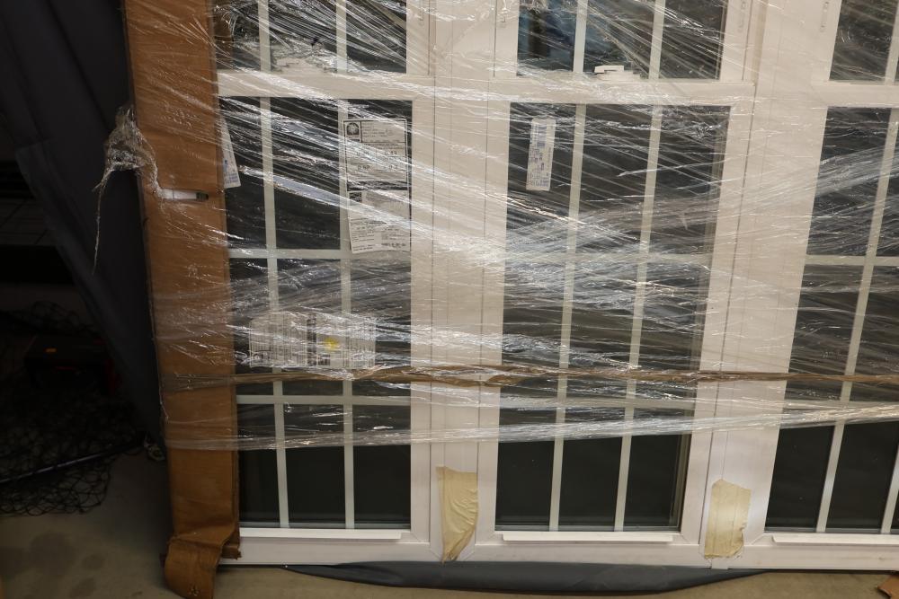 Vinyl Double Hung Dual Glazed Window Set with Energy Performance Ratings. Features 5/8-inch grid design, dual glazing, tempered low-e argon. Labeled as Series 3201, this set includes ENERGY STAR certification with U-Factor of 0.26 and Solar Heat Gain Coefficient of 0.43. Dimensions provided on the label are 36 inches by 74 inches. Pickup only.