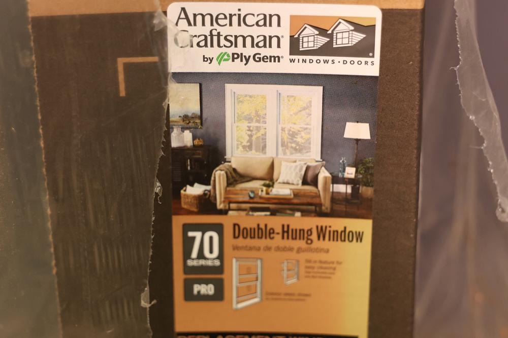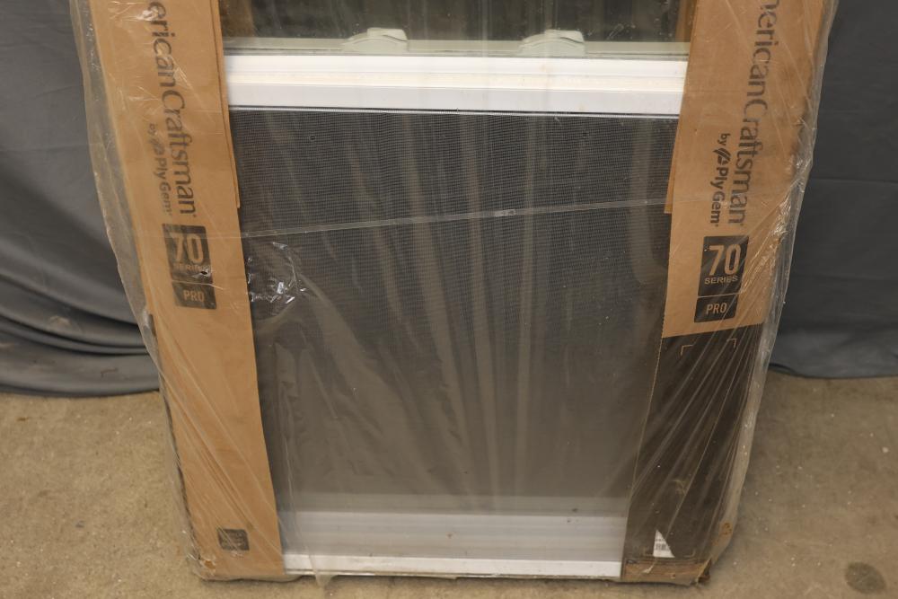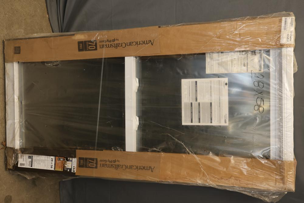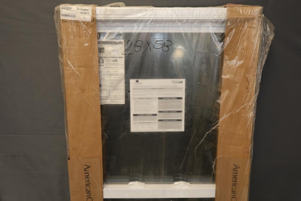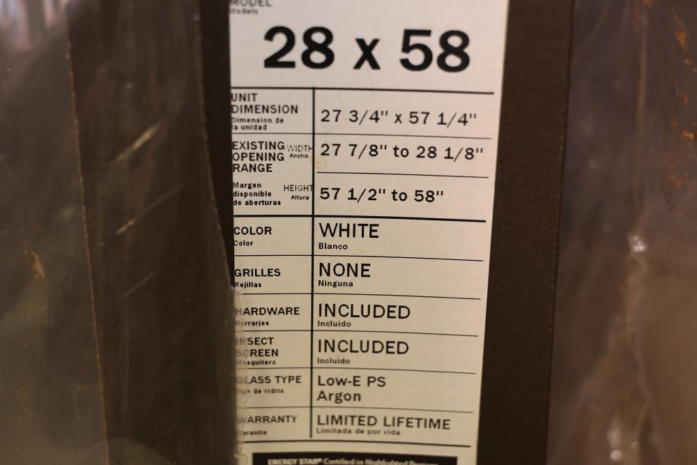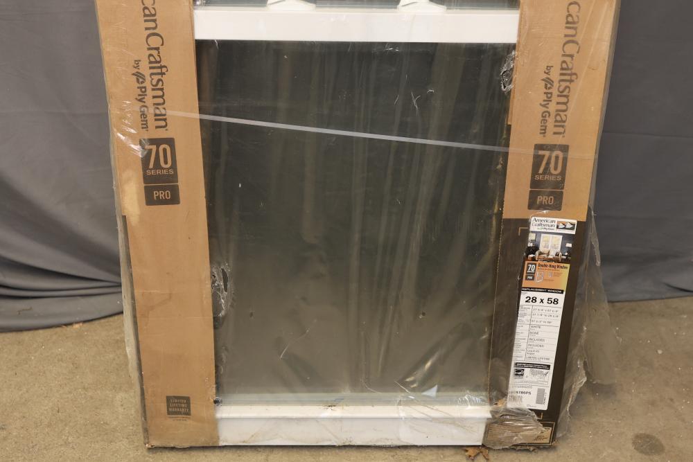 American Craftsman 70 Series Double-Hung Window with dimensions 28x58 inches. Features Low-E PS Argon insulated glass, white finish, and included hardware. The unit dimensions are 27 3/4" x 57 1/4", with existing opening range from 27 7/8" to 28 1/8" wide and 57 1/2" to 58" high. Pickup only.