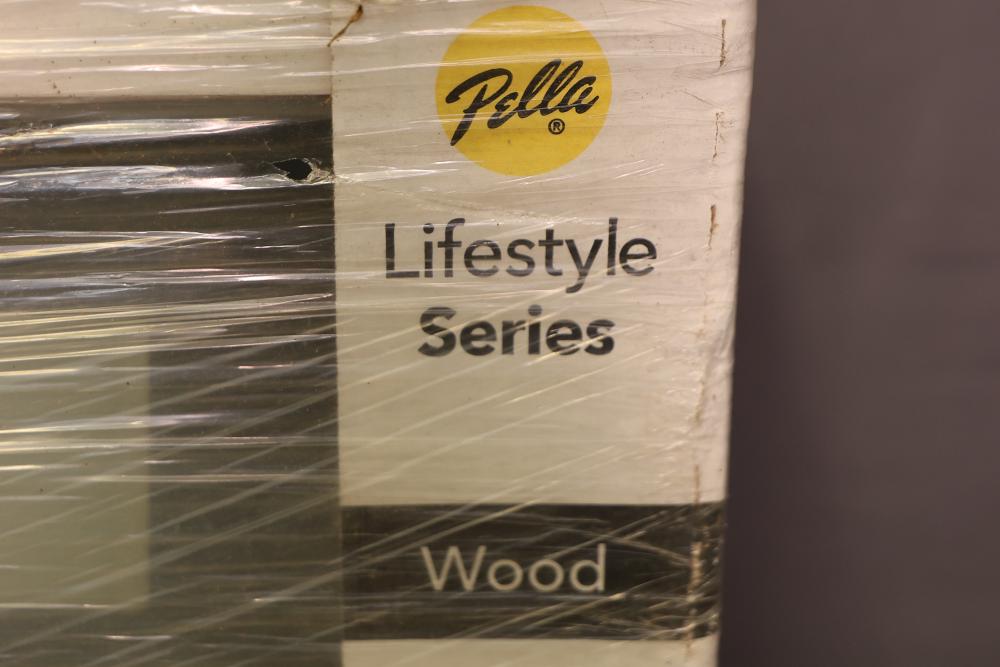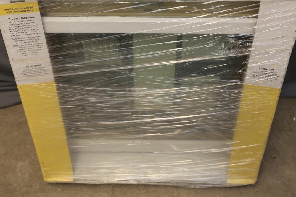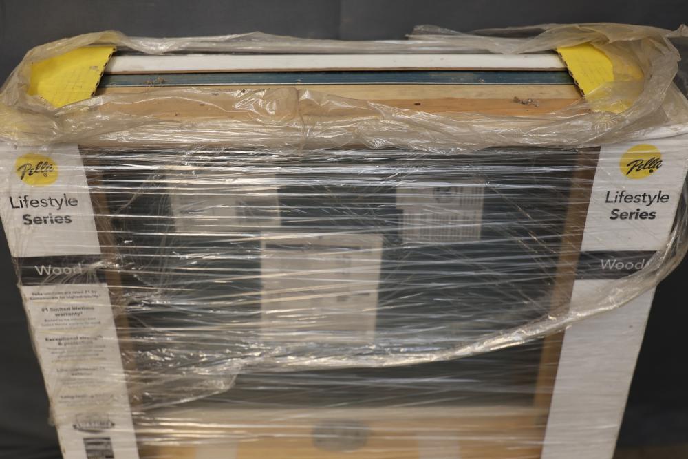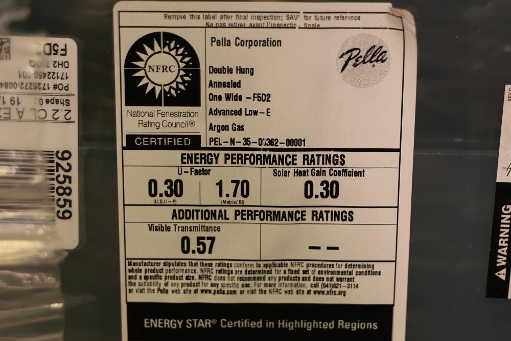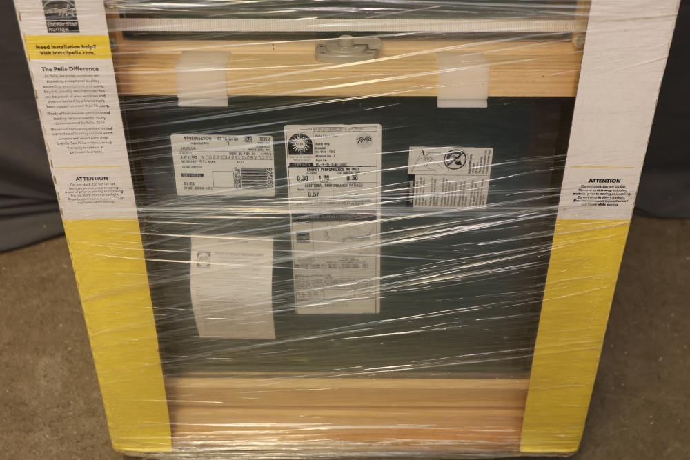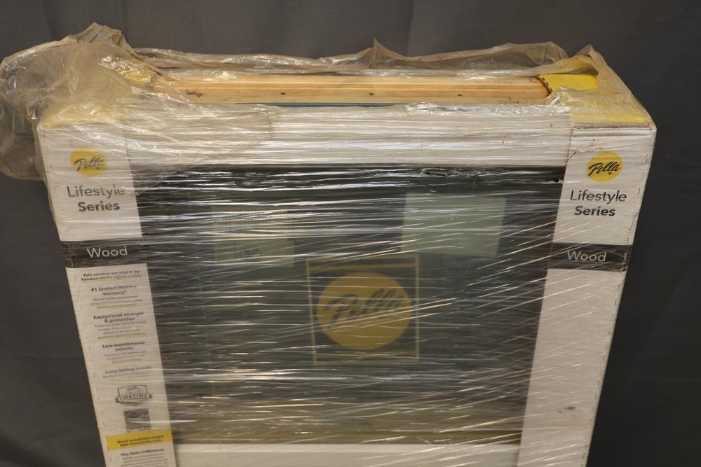 Pella Lifestyle Series Double-Hung Wood Window with Argon Gas, featuring a U-Factor of 0.30 and Solar Heat Gain Coefficient of 0.30. 24 x 38 inches. Energy Star certified with additional performance ratings including Visible Transmittance of 0.57. The window is new, packaged, and comes with clear protective wrapping. Pickup only.