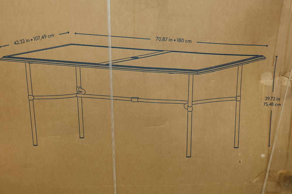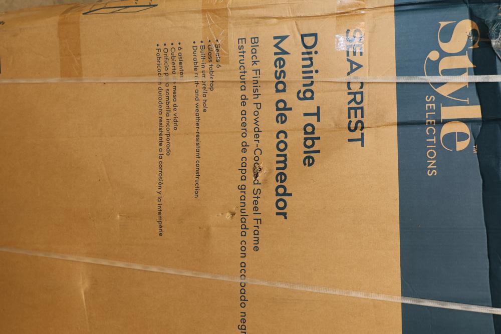 Style Selections Seacrest Dining Table With Black Powder-Coated Steel Frame. New and in original packaging, the table measures approximately 70.87 inches in length, 42.32 inches in width, and 29.72 inches in height when assembled. Pickup only.