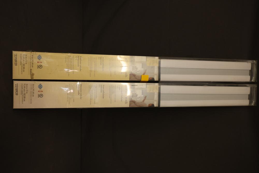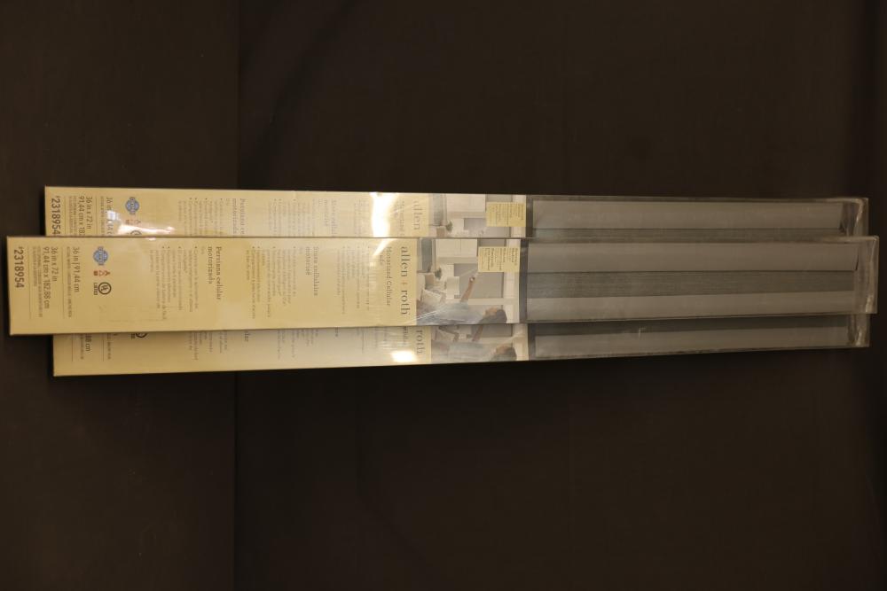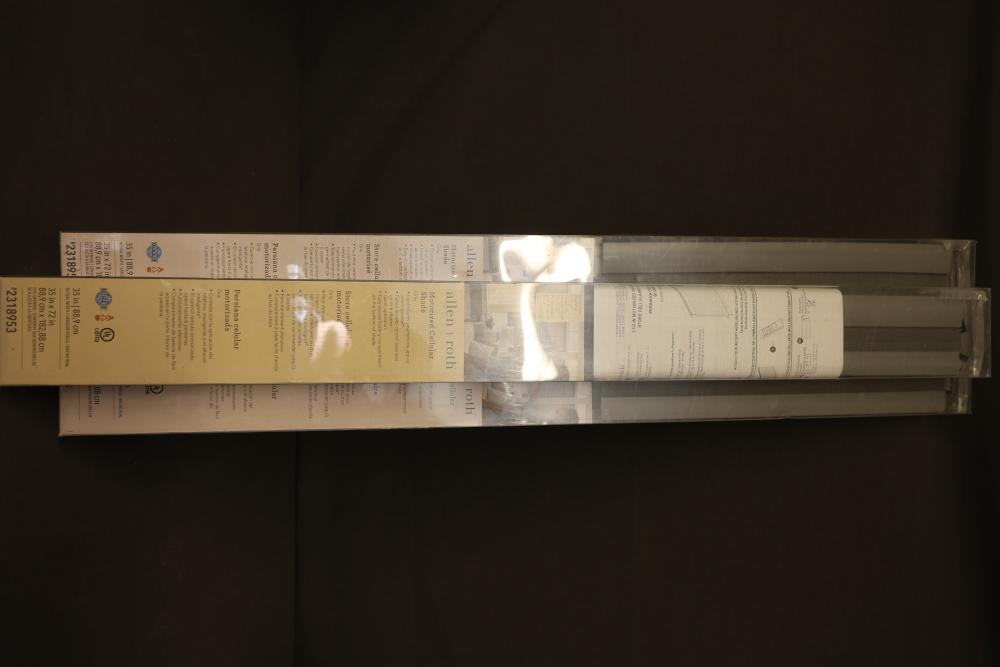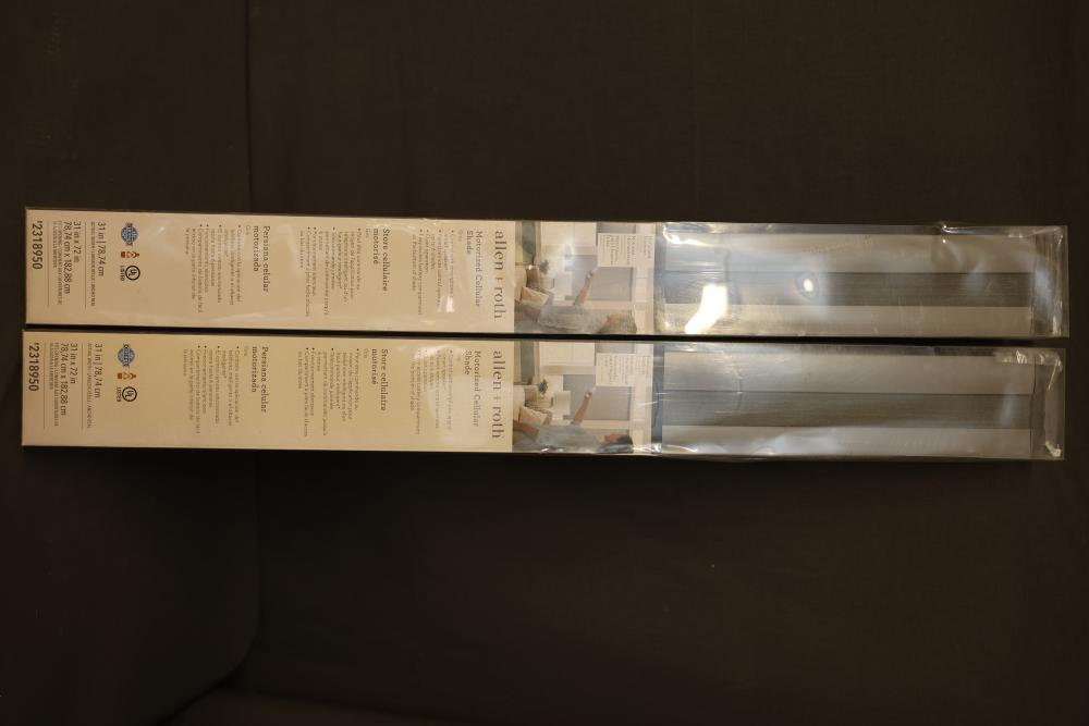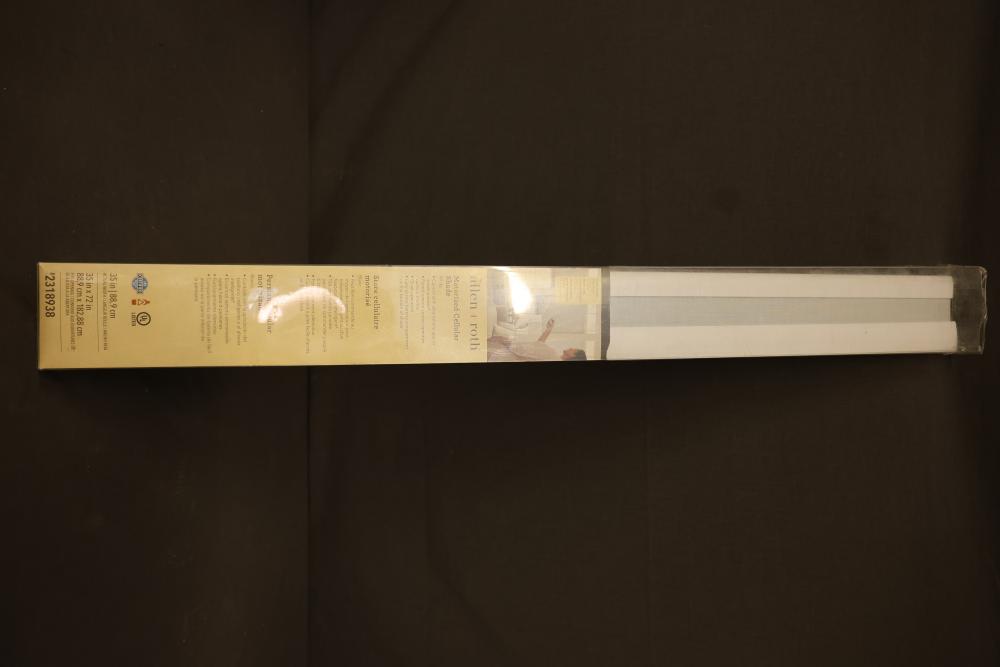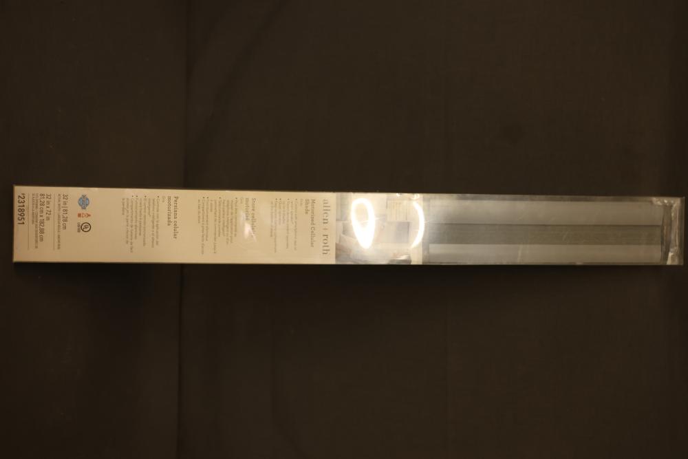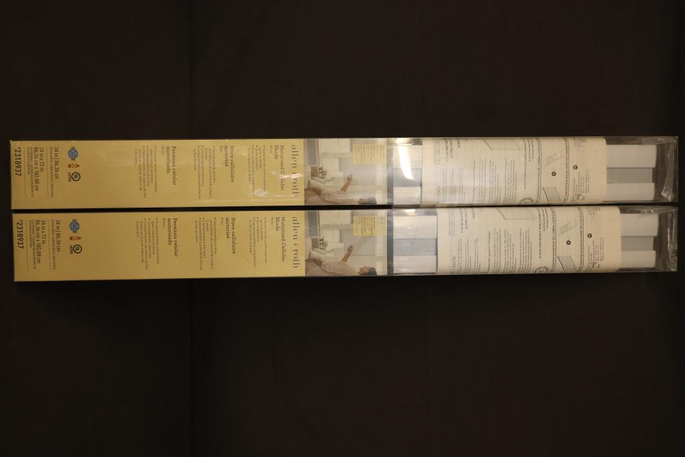 Allen + Roth Motorized Cellular Shades, 36x72 inches, white. The paired remote control operates up to 6 shades and offers quiet operation. The shade features an easy battery compartment on the back for simple power replacement. Certified and UL listed. Pickup only.