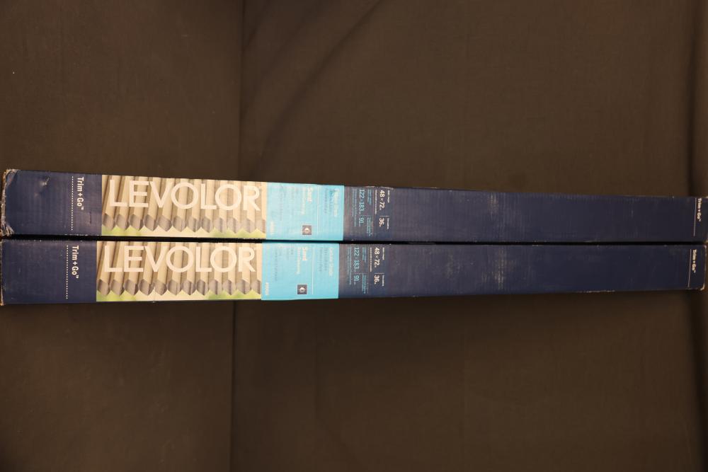 Levolor Trim+Go Sand Cellular Shades 48x72 Inch Set of 2. These room-darkening shades feature a cellular design, measuring 48 inches in width and 72 inches in height, with a trim width of up to 36 inches. Designed for light control and energy efficiency. Pickup only.