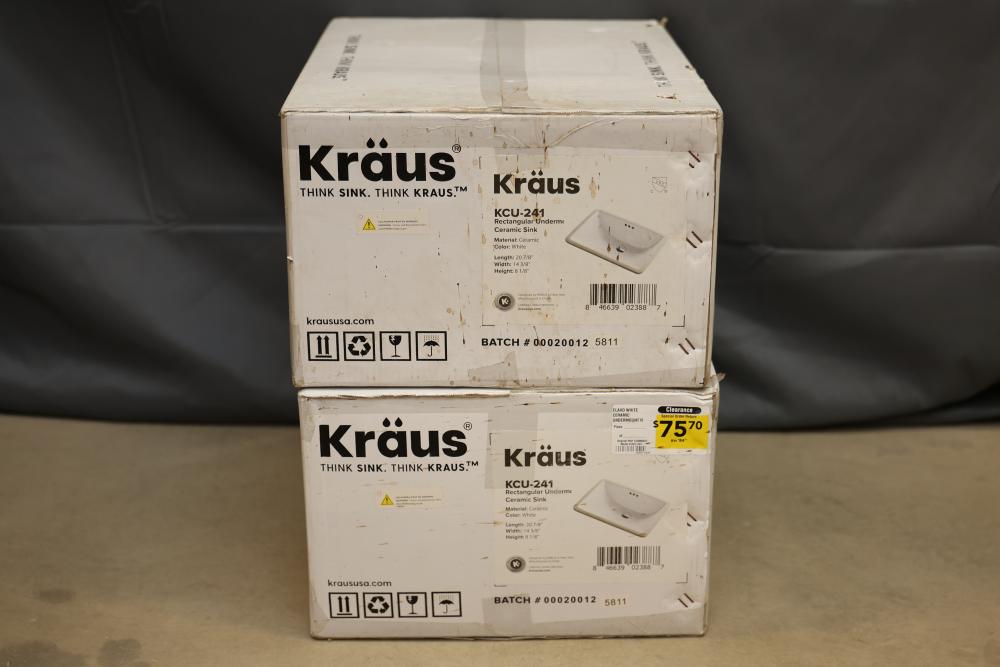 Kraus KCU-241 Rectangular Undermount Ceramic Sink, White. Material is ceramic, and the sink has dimensions of 20 7/8 inches in length, 14 3/8 inches in width, and 8 1/8 inches in height. New and packaged in original boxes. Pickup only.