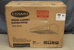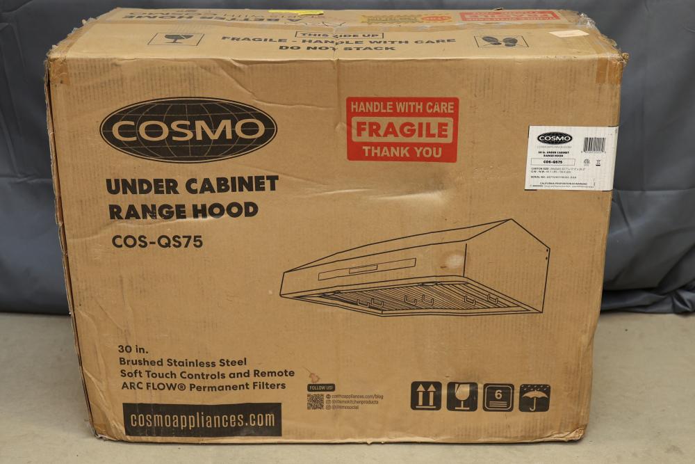 Cosmo 30-Inch Under Cabinet Range Hood COS-QS75. Features brushed stainless steel, soft-touch controls, remote operation, and ARC FLOW permanent filters. Carton size measures 33.7" x 17.3" x 26.2" with a weight of 66.1 lbs. Intended for under-cabinet installation. Boxed and includes all packaging materials. Pickup only.