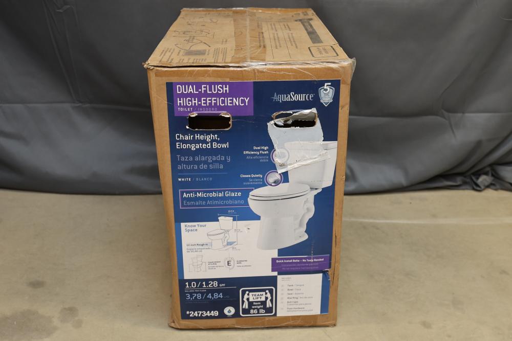 AquaSource Dual-Flush High-Efficiency Toilet, Chair Height, Elongated Bowl. Features dual-flush functionality, anti-microbial glaze for cleanliness, and a 1.0/1.28 GPF water efficiency. Includes components necessary for installation. Item weighs approximately 86 lbs and is white in color. Outer packaging shows signs of wear. Pickup only.