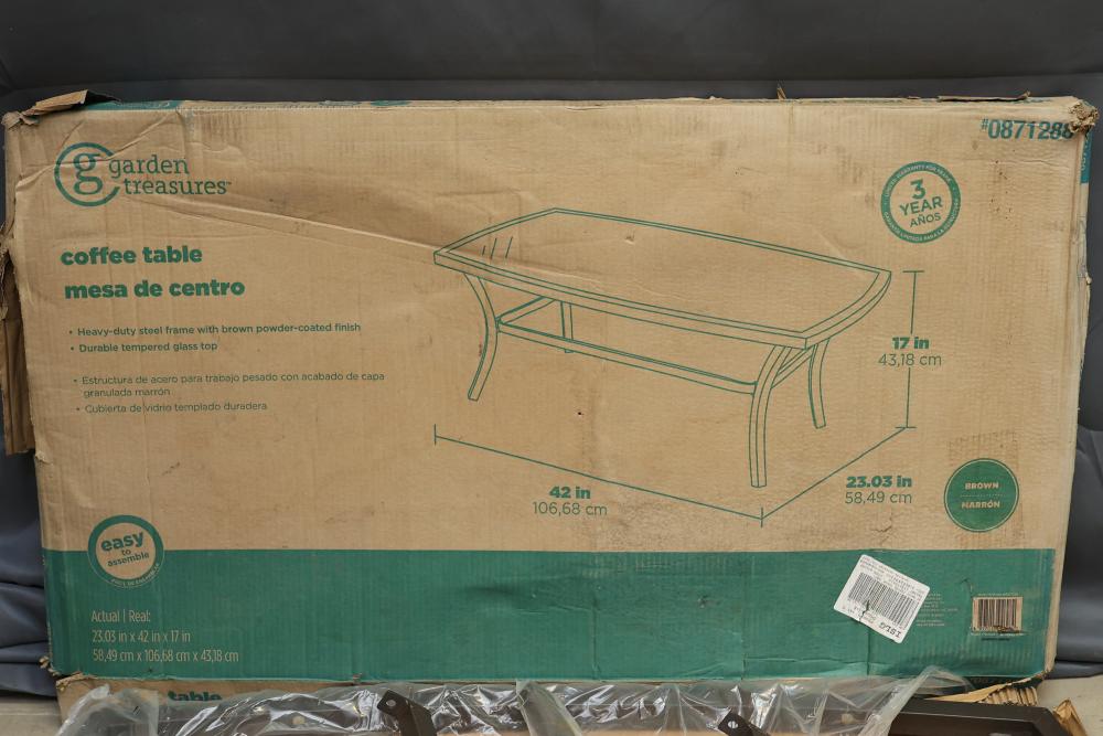 Garden Treasures Coffee Table with Glass Top and Metal Frame. Measures 23.03 in x 42 in x 17 in (58.49 cm x 106.68 cm x 43.18 cm). Easy to assemble. Box shows signs of wear, but the contents appear unused and are still in original packaging. Pickup only.
