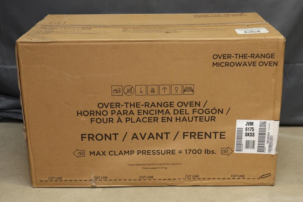 Over-the-Range Microwave Oven with Stainless Steel Finish. Model JVM6175SKSS. Product dimensions are 16-5/16" H x 29-7/8" W x 15-9/16" D with a weight of 51-57 lbs. Includes components such as glass turntable, installation kit, and manuals. Packaging is opened but product appears unused. Pickup only.