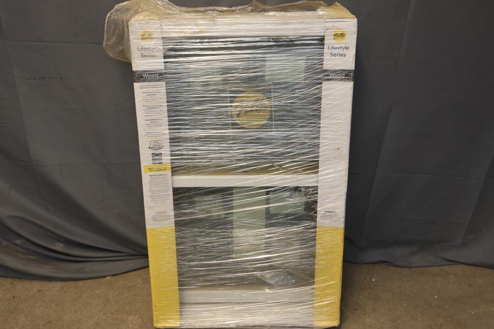 Pella Lifestyle Series Double-Hung Wood Window with Argon Gas, featuring a U-Factor of 0.30 and Solar Heat Gain Coefficient of 0.30. 24 x 38 inches. Energy Star certified with additional performance ratings including Visible Transmittance of 0.57. The window is new, packaged, and comes with clear protective wrapping. Pickup only.